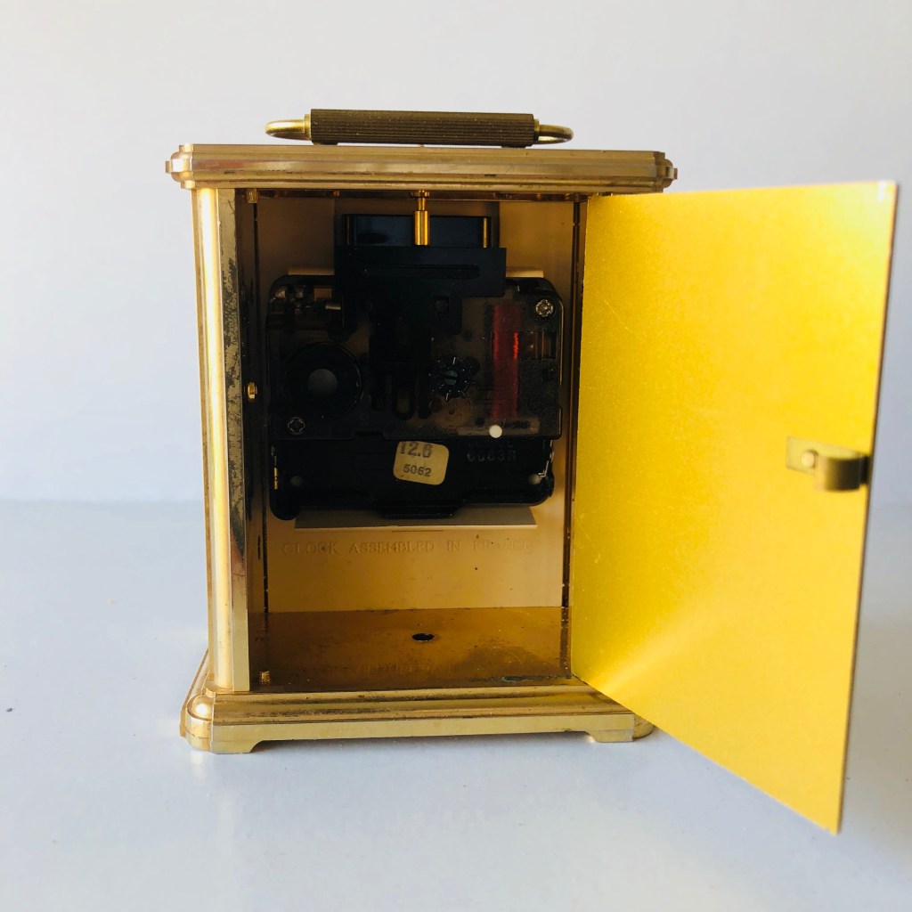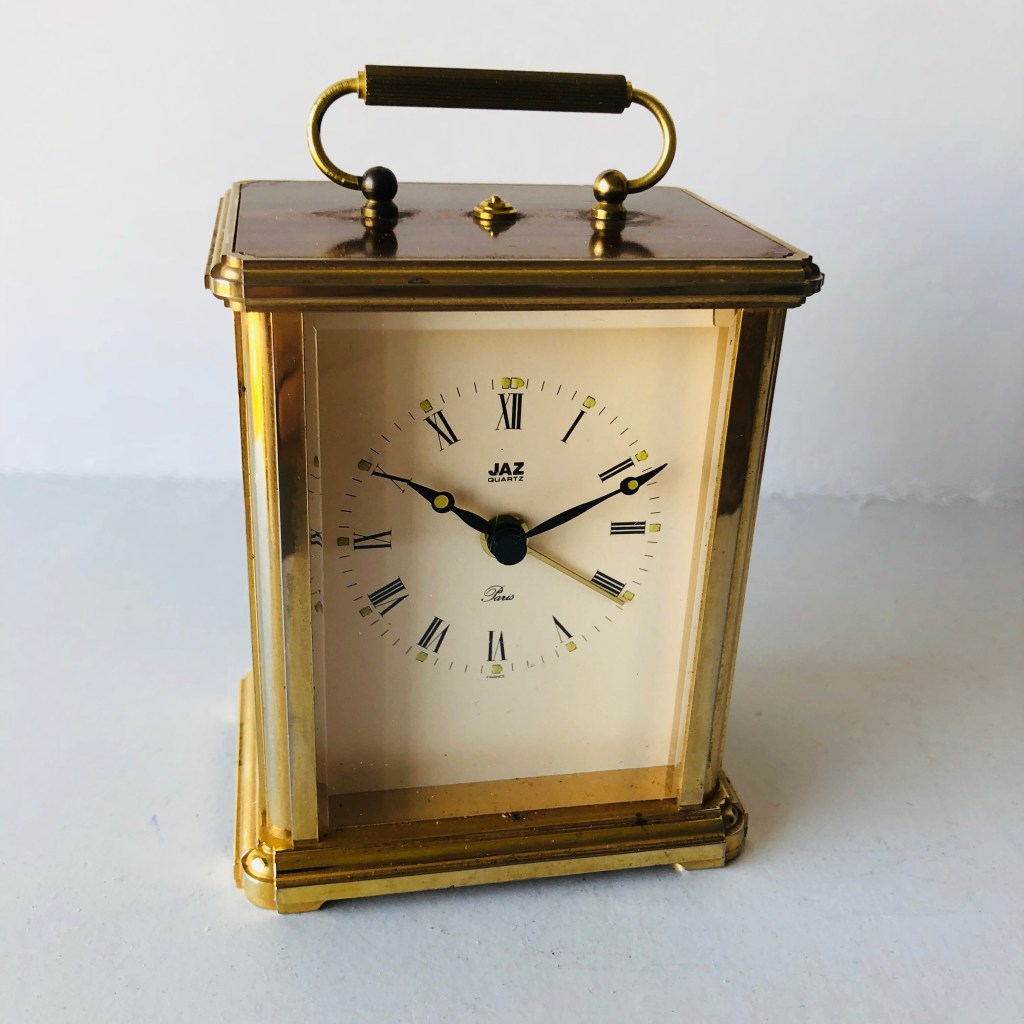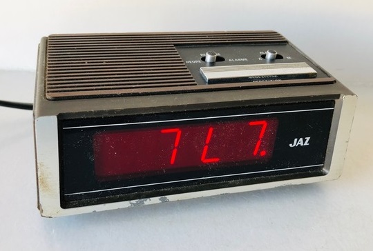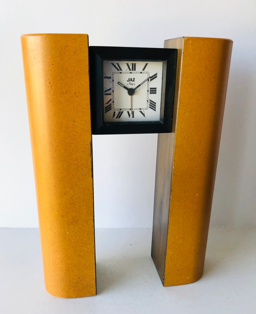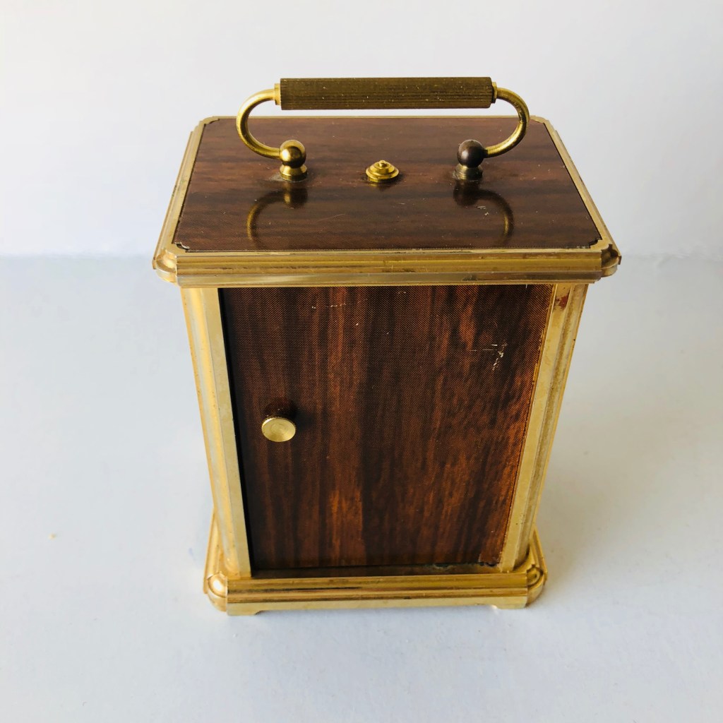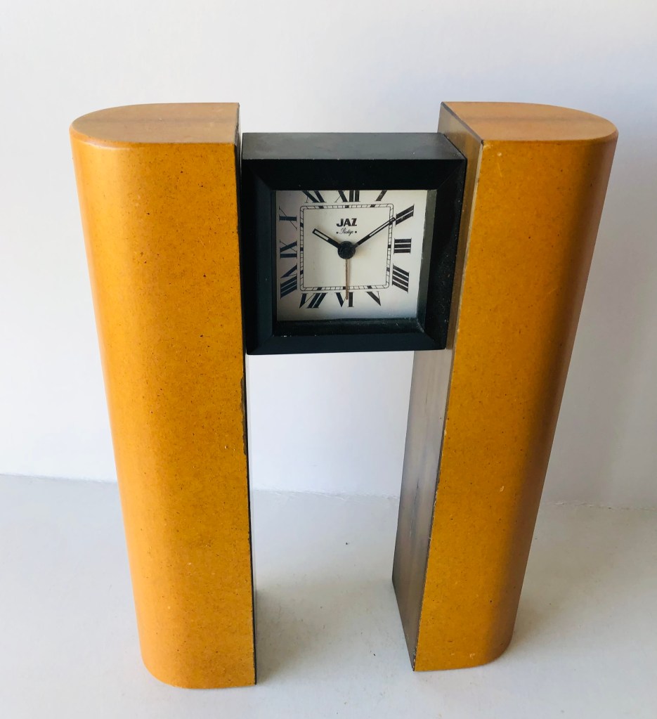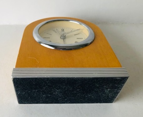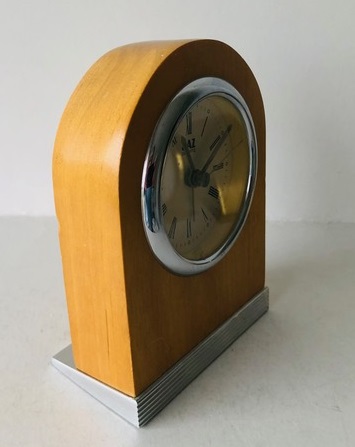 7219 horloge murale, à dateur date et jour, mouvement quartz à pile LR6, chiffres romains sur cadran émaillé, trotteuse centrale noire, forme octogonale en bois composite façon noyer de couleur brune et non pas noir contrairement à la photo du catalogue, présente uniquement au catalogue 1993/94 à la page 59. Format: 25 x 25 cm.