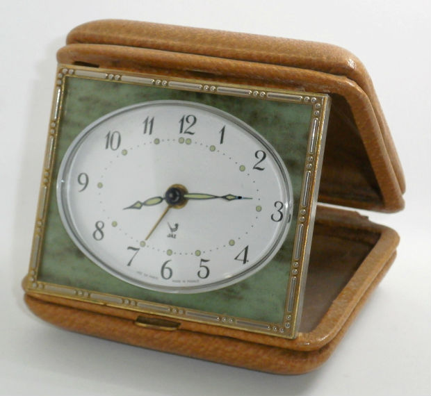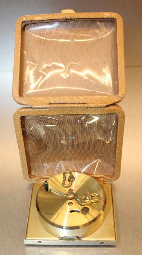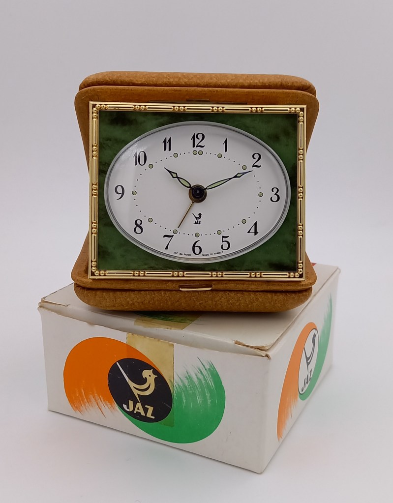 FORMIC , réveil de voyage de la gamme des Stylites de voyage, mouvement mécanique , calibre DV , aiguilles et points lumineux , mention Made in France en bas de cadran. Nouveauté du catalogue de 1970-1971 à la page 2 . Portefeuille gainé cuir façon porc et décor vert marbré , référencé 1314-71 .