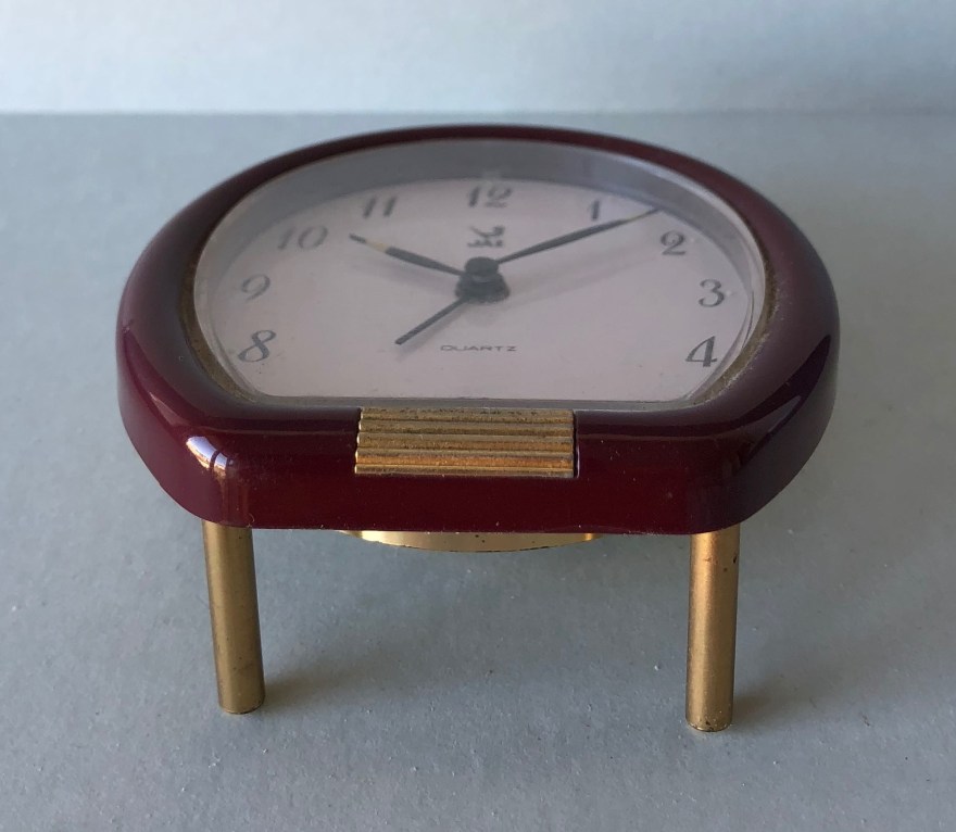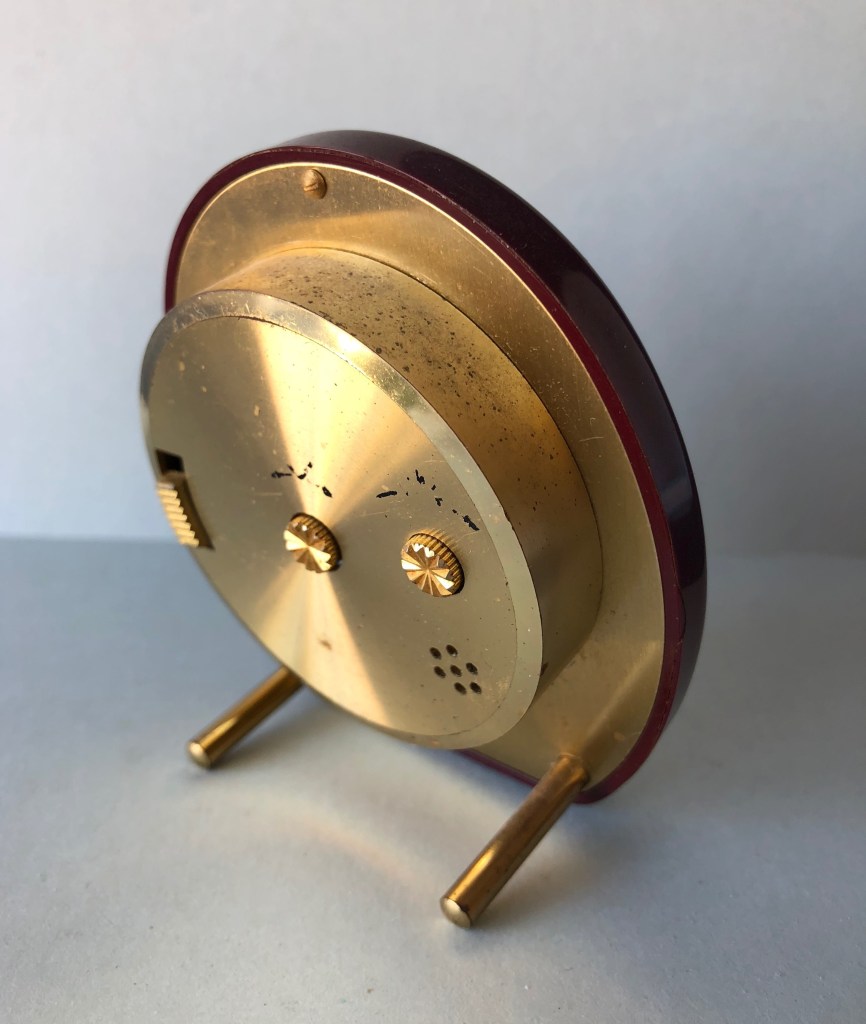 Boîtier et cloche au dos en laiton peint de couleur bois de rose , cadran argenté , en écrin simili-cuir havane ; pieds boules , aiguilles phalliques et chiffres lumineux . Diamètre 6,5 cm , poids total 210 gr .