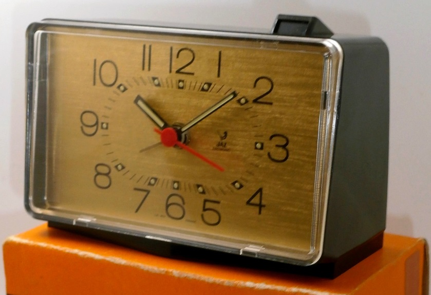CHARMIC , réveil , Jaz Electronic , sonnerie moduleur et tic-tac discret , mouvement électronique , à pile LR14 , calibre TR , licence ATO . Nouveauté du catalogue 1975 à la page 5 . Dimension 10,5 x 7 x 5,2 cm . Corps en plastique , arrêt de sonnerie au sommet , trotteuse centrale , chiffres et points lumineux .