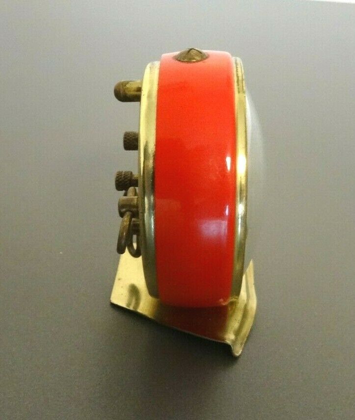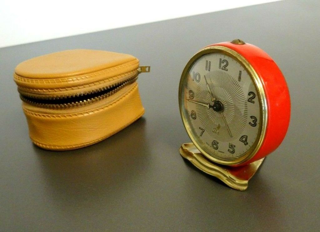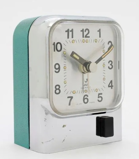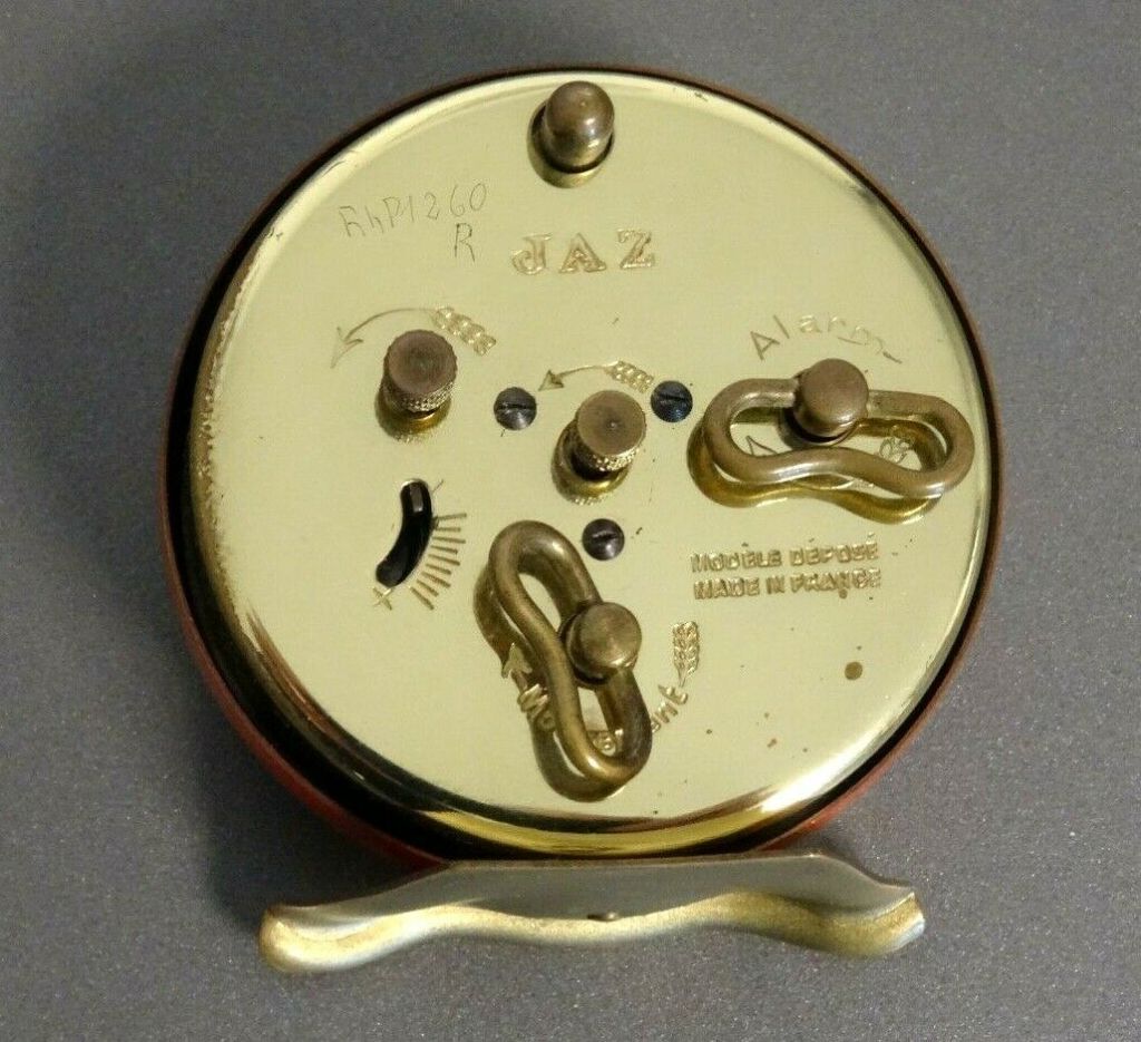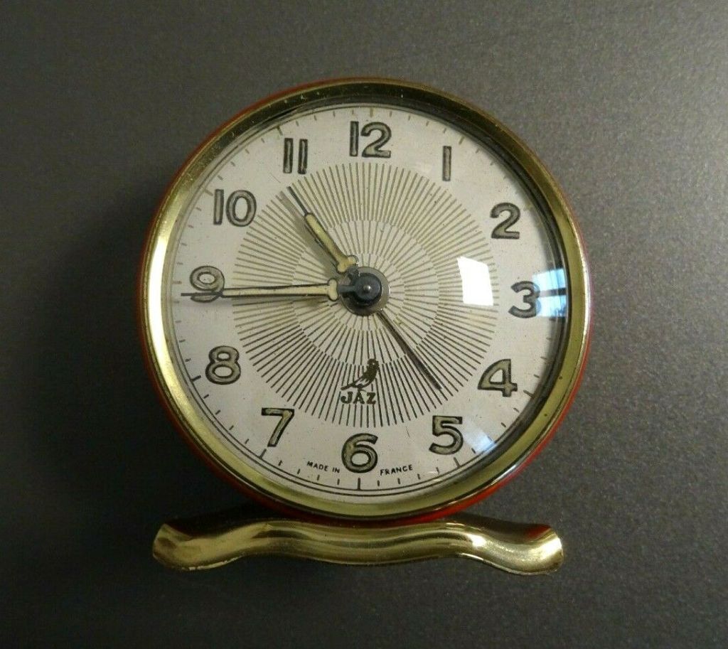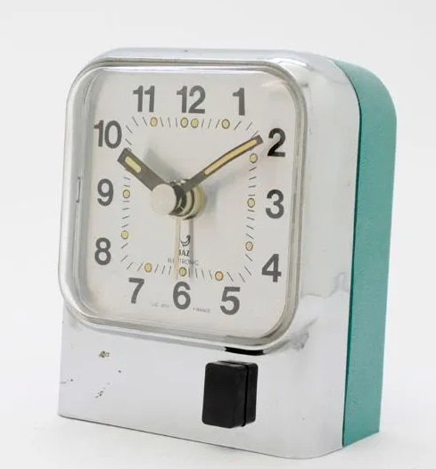 RAVIC , petit réveil de la gamme des Jaz Transistor , mouvement électrique à pile LR14 , calibre 2AV à transistor , licence ATO . Nouveauté du catalogue 1964-65 à la page 18 , référence 2601-11 . Lunette métal façon or , fond noir , boutons noirs et « or » sur décor en plastique doré ; cadran blanc , traits d’heures noirs , aiguilles dauphines , aiguilles et chiffres « or » lumineux . Format 7 x 9,5 cm, poids sans la pile 290 gr . Notons que le bouton de gauche remonte le mécanisme de la sonnerie , le petit bouton central est celui de l’arrêt sonnerie et celui de droite sert à régler l’heure de la sonnerie . Il n’est plus disponible en 1969 . A travers le RACLIC , il fait l’objet d’une sorte de déclinaison esthétique et technique . Les mouvements AV sont à transistor mais la sonnerie reste mécanique . Le 23 Juin 1965 , l’ Etat Français a fait l’acquisition de deux RAVIC inventorié au Mobilier National sous les numéros d’inventaire : GML-8290-006 et GML-8290-005 .