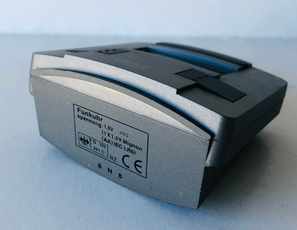 9110/9111 réveil thermomètre , gamme Jaz Tech , réveil radio-contrôlé , écran LCD , sonnerie progressive , sonnerie à répétition, arrêt de sonnerie en façade , éclairage du cadran , corps en plastique ; Existe en deux versions : réf 9110 corps gris métallisé, boutons noirs ou réf. 9111 noir métallisé ,bouton bleu marine. Pile LR6 . Disponible uniquement au catalogue 2000 . Sous le réveil un aigle stylisé et la mention BZT l’acronyme Bundesamt für Zulassungen in der Telekommunikation ( Office fédéral des licences dans le secteur des télécommunications ) rappelle qu’une redevance est payée par le constructeur à ce bureau fédéral allemand pour bénéficier de ce service européen de radio pilotage , il est d’ailleurs probablement fabriqué en Allemagne .