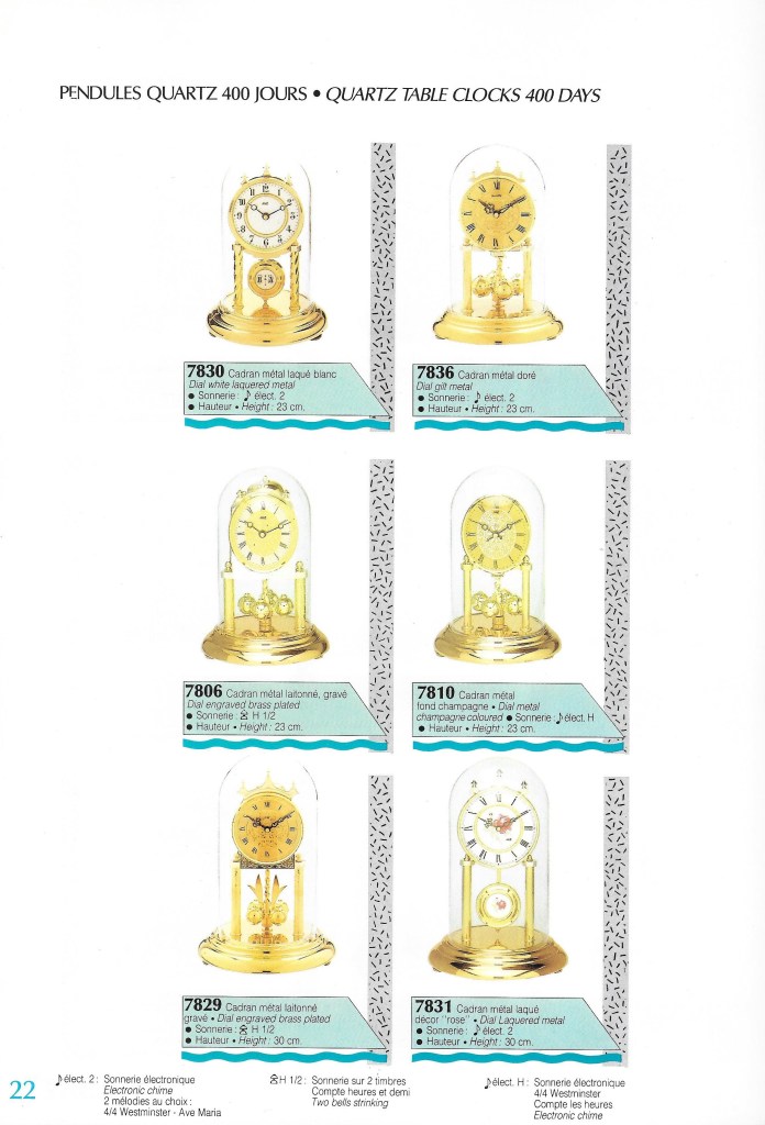 G7867 , horloge à poser façon 400 jours , sous globe en verre , sonnerie Bim-Bam sur timbre tous les 1/2heures , égrène les heures , aiguilles noires fleurs de lys , timbre cloche au sommet , mouvement quartz , à pile LR6 , Made in Germany , chiffres romains sur cadran rond blanc , colonnes dorées , Made in Germany , 23 cm de haut ; Nouveauté du catalogue 1993 .