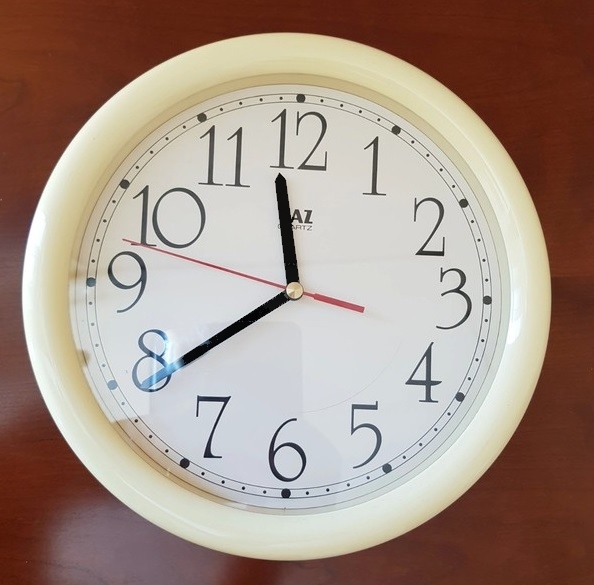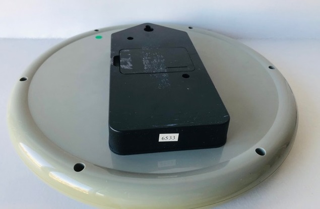 5478 , petit réveil rond , quartz à pile LR6 , corps en plastique , trotteuse centrale noire , aiguilles noires lumineuses , arrêt de sonnerie au sommet