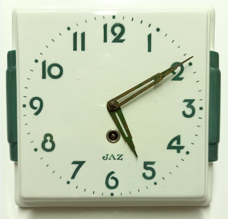 La production ayant été interrompue pendant la guerre sur ordre de l’occupant , qui avait interdit toutes productions de céramiques , la SOFIC réapparaît au catalogue 1946 , référencée n° 631.10 . Corps en faïence ivoire , chiffres et filets bruns peints , aiguilles « buildings » , sans trotteuse . Format 28,5 x 22 cm, poids 1,4 kg .