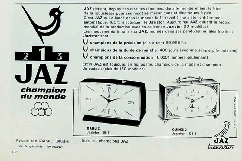 QUINZIC , réveil à transistor, de la gamme des Jazistor , Jaz Electric , mouvement électrique à pile LR14 , calibre 5AR , licence ATO , sonnerie sur cloche . Présenté dans le catalogue de 1968-1969, page 14 , réf. 2431-11 . Boîtier en laiton doré, cadran plastique blanc , chiffres Breguet , aiguilles Breguet dorées , aiguilles et points lumineux , pieds miches avec caoutchouc blancs anti-gliss , arrêt de sonnerie au sommet sous la bélière , mention France au dos . ( ATTENTION: pieds et bélière sont rivetés , ne cherchez pas à les dévisser ) Dimensions 11,5 x 8,5 cm ,poids 595 avec la pile LR14 . Son design se rapproche beaucoup des autres nouveautés à transistor de son époque : NOVIC , CHANIC , PERLIC ou encore DUNIC . Toutefois il tire son nom de son style très vaguement Louis XV . En effet si la gamme Jaz comprenait les pendules en Formica aux couleurs acidulées et réveils aux formes contemporaines , elle n’omettait pas de proposer pour les intérieurs bourgeois des réveils « de style » plus ou moins Louis XVI pour le SEIZIC et vaguement Louis XIII avec le TREIZIC . Etonnante longévité puisqu’il est présent au catalogue pour la dernière fois en 1976 .QUINZIC à l’export le QUINZIC est renommé ARC de TRIOMPHE , comme le DRILIC rebaptisé MILORD , le CASTIC devenu RICHELIEU , le RAVIC nommé EIFFEL , etc . Les prix sont exprimés en Francs belges dans cet encart publicitaire ; format 18,8 x 13,8 cm .Publicité Paris Match 34 x 26,5 cm , tarifs au 15/2/1967 (mention verticale dans la marge) .publicité double page Paris Match , 34 x 52 cm .publicité décembre 1965 double page , variante bichrome de la précédentepublicité Paris Match pleine page pour les photos + 1/3 pour le texte à gauche , 35 x 34 cmpublicité pleine page Paris Match n°922 , Déc. 1966 , 34 x 26 cm .publicité pleine page Paris Match , 34 x 26 cm .Publicité double page 1968publicité Paris Match , format 34 x 13,5 cm . Fêtes des mères , communions , Pâques , Noël étaient autant d’occasion tous les ans d’intenses campagnes publicitaires . Si pour Paris Match – plus haut – le vouvoiement est de mise , dans cette petite publicité en noir et blanc , publiée dans une revue destinée à la jeunesse c’est le tutoiement qui l’emporte . Format 12,5 x 9 cm . Tutoiement de rigueur pour ce petit encart publicitaire dans une revue pour jeunes en 1967 , même si cette QUINZIC nous semble bien trop « habillée » et » bourgeoise » pour cette clientèle spécifique . publicité presse hebdomadaire 1965 , demi page , format 30,5 x 16 cm .