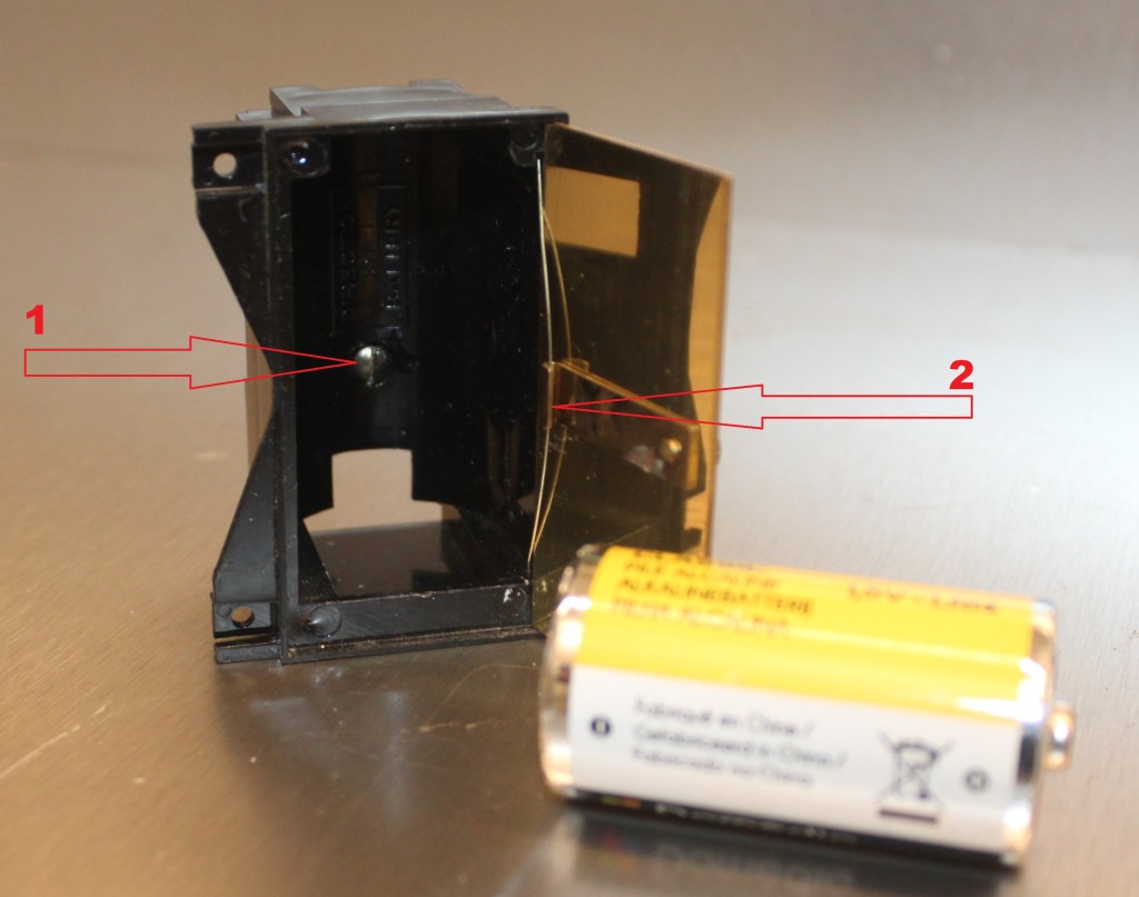 pour le démontage : enlever d’abord la pile puis dévisser la vis qui maintient le logement de la pile ; ne pas enlever la porte uniquement uniquement tenue par une tige/ressort qui referme la porte automatiquement