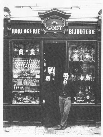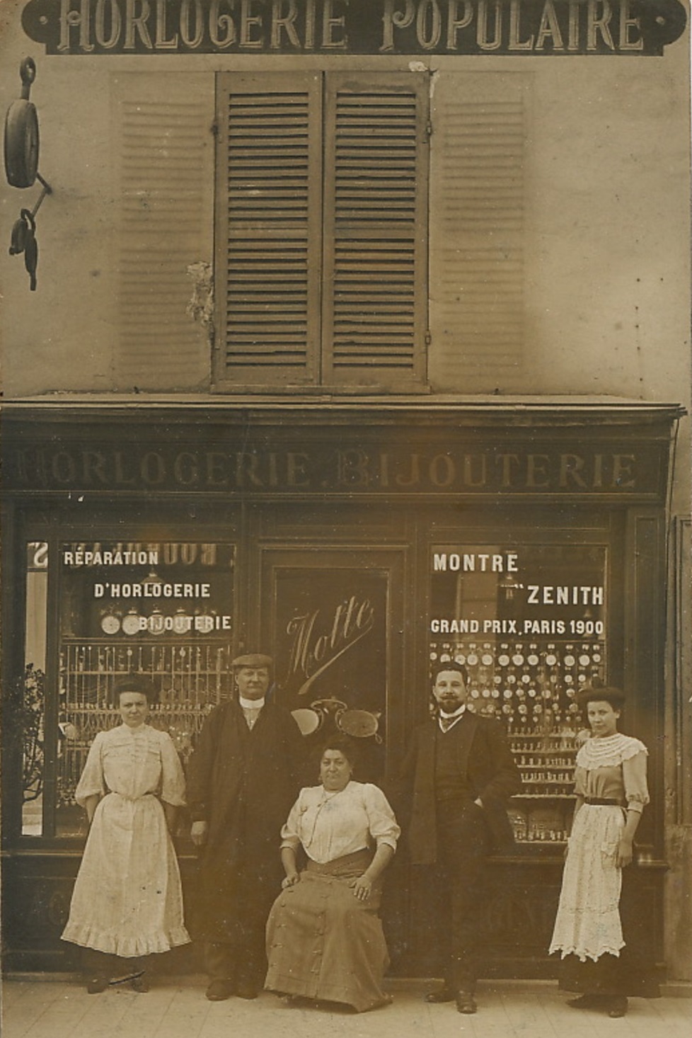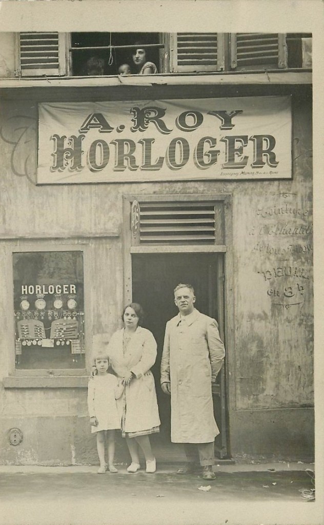 Les premiers horlogers, réparateurs /revendeurs, apparaissent lors de l’industrialisation de l’horlogerie et la diffusion de masses des carillons puis des réveils, soit à la charnière du XIX° et du XX°, occupant souvent de petites boutiques, voire toutes petites.Une porte vitrée et deux étroites vitrines sont la configuration la plus courante des horlogers.La vitrine est parfois à peine plus large que la porte.