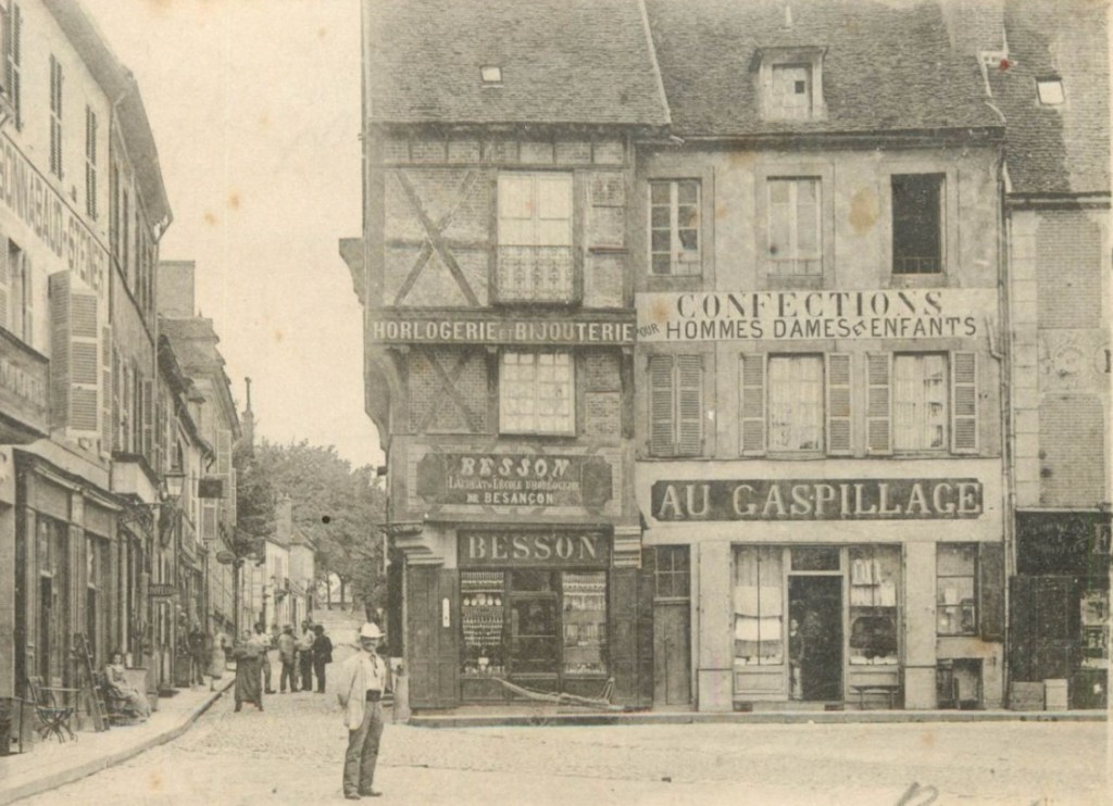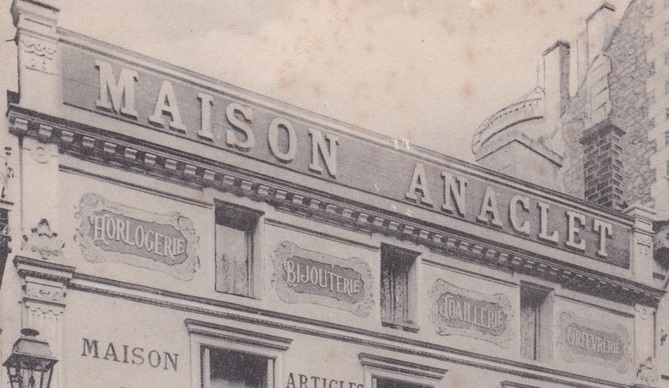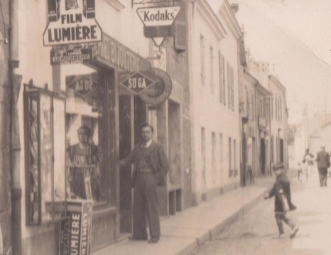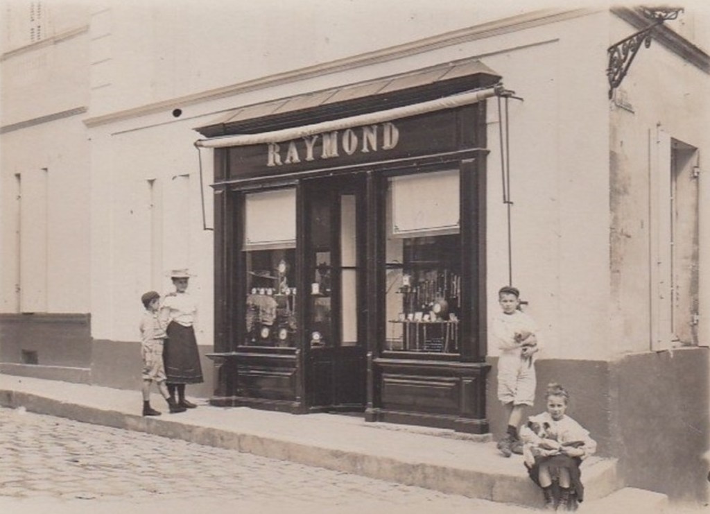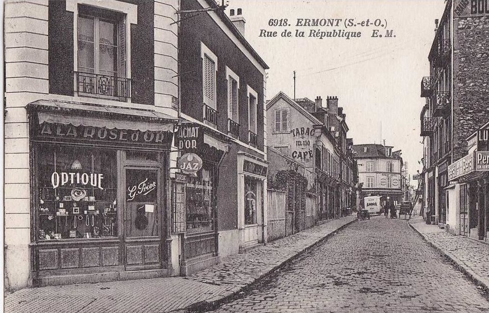 La maison « à la rose d’or », d’Ermont en Seine et Oise, affiche clairement son activité d’optique, dont on peut se demander s’il s’agit d’une activité principale ou secondaire en rapport avec son grand œil dans la vitrine et l’inscription blanche sur la vitre. La plaque émaillée Jaz atteste qu’on est vers 1925, période à laquelle les opticiens commencent à prendre leur indépendance, comme LISSAC, maison fondée comme Jaz en 1919, et monteront en puissance pour diffuser les lunettes de Morez qui est la patrie des montures en métal, tandis qu’Oyonnax sera la grand spécialiste des lunettes en plastique.