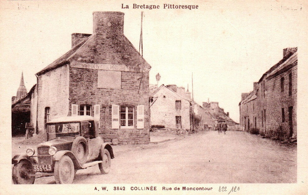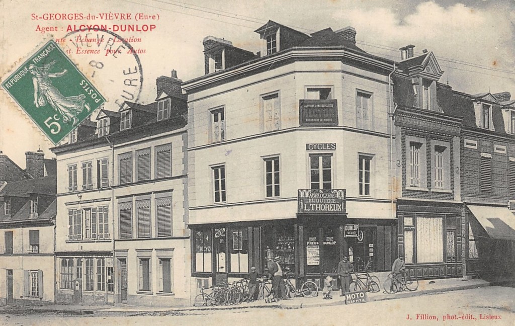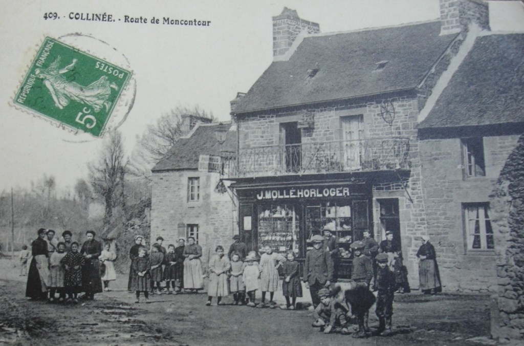 Si cette horlogerie bijouterie de Jugon les Lacs, également lunetterie comme en témoignent ces binocles en enseigne, aligne une belle file de vélos, il ne s’agit pas des véhicules de sa clientèle mais de cycles à vendre. Le monde de l’horlogerie n’est pas si étranger à celui des cycles puisqu’on retrouve des horlogers à plusieurs étapes de leur invention. En 1834, l’horloger Julien-Benjamin Roussel est le premier à vouloir faire mouvoir un vélocipède à l’aide d’une transmission par chaîne sans fin. Il en dépose le brevet le 8 avril 1835 sous le titre de « voiture marchant par le moyen d’une mécanique mue à bras d’hommes ». Sans doute beaucoup trop lourd pour être utilisé sur route, mais l’idée est là et il reste le premier véhicule à transmission par chaîne jamais construit.