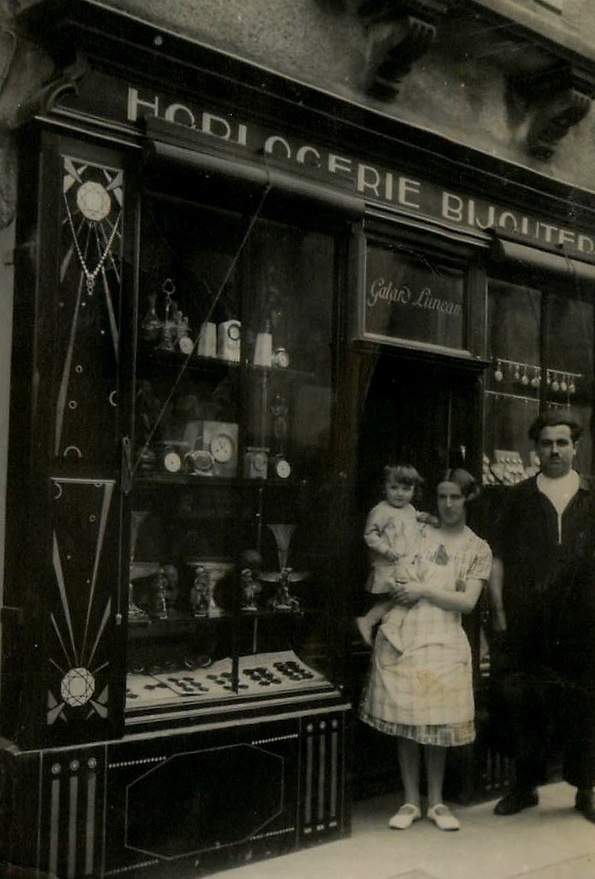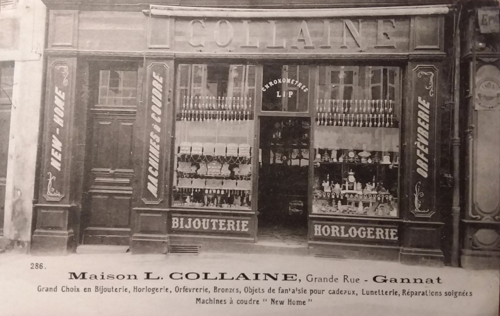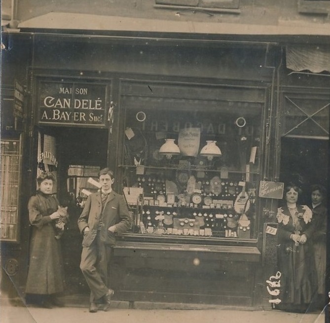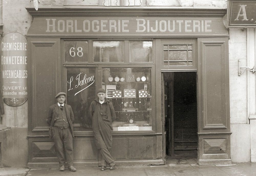 On notera les pavés qui permettent de tenir la pose à une période où les temps de pause des plaques photographiques étaient importants. Cet horloger bijoutier avec sa belle plaque émaillée Jaz, malgré l’étroitesse de sa boutique, vendait également des cycles et des machines à coudre faisant cohabiter Jaz Classic et phares automobiles à acétylène.