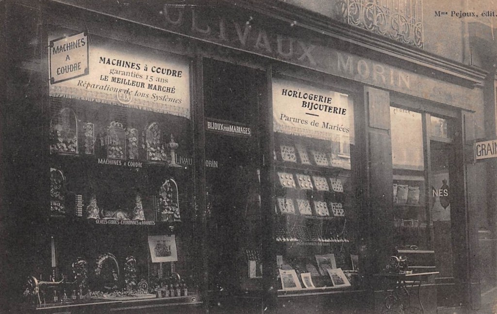 La carte postale montre deux machines à coudre sur le trottoir; il est probable qu’il s’agisse d’une mise en scène publicitaire organisée par le photographe puisque les intempéries sont incompatibles avec la fragilité des boiseries des machines.New-Home était une fameuse marque américaine de machine à coudre.Cette affiche présente pour nous un double intérêt; celui d’être amusante mais surtout elle précise clairement dans la dernière ligne du bas que les marchands de machines à coudre souhaitaient être distribués par des horlogers bijoutiers.On trouve encore quatre machines sur le trottoir, et autant de vélos, probablement pour gagner de la place et attirer le chaland.Encore le tandem machines à coudre et vélos auquel s’ajoutent la literie et la chapellerie.
