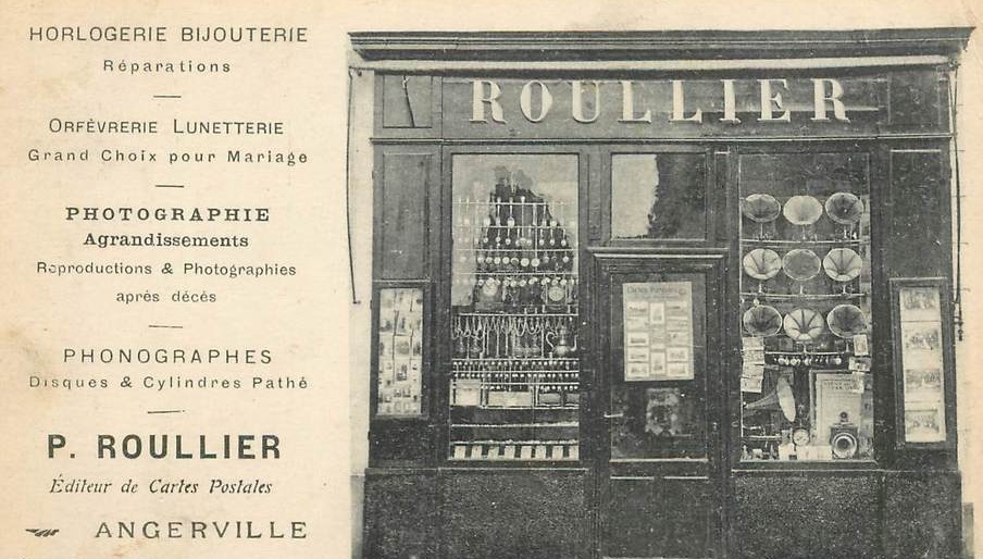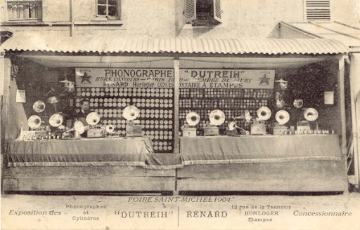 Derrière notre horloger ce ne sont pas des réveils ronds qui tapissent son stand de foire mais des cylindres pour phonographes.On notera qu’il ne vend que des phonos mais se revendique ouvertement comme horloger.Sa veuve cumulera, elle aussi, les activités les plus diverses, où les phonos gardent une belle place.
