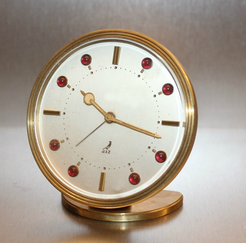 Petit réveil , mouvement mécanique , calibre CH ,7 jewels . Cadre et socle en métal doré , cadran en métal brossé , vitre plate en plexiglas , chiffres Breguet , aiguilles Breguet , aiguilles et points lumineux . Format 7 x 7,5 cm , 275 gr . Le chiffre 8 dans un cercle qui est reproduit au cadran rappelle l’autonomie de 8 jours de ce calibre d’origine suisse , justifiant la mention Swiss Made sous le VI .La mention Swiss est redoublée au dos La référence 800 CH de ce calibre , à échappement ancre et 7 pierres , fait évidemment référence à son origine suisse . Daté en creux de 1970 sur le calibre , ce réveil n’apparaît pourtant pas aux catalogues français de cette période . Le calibre 800 CH fera sa première apparition officielle au catalogue 1971/72 dotant les BANIC , BRILIC , BRONZIC , BULIC et le réveil de voyage BERNIC . Mais nous savons par les Jazettes , le journal interne de communication avec les horlogers affiliés , que Jaz testait régulièrement de nouveaux modèles à l’export avant de les introduire ou pas sur le marché français comme par exemple la LORENESE qui ne sera vendue qu’en Italie . Apparemment ce modèle , que nous avons acquis en Allemagne , ne sera pas retenu mais avait servi de test pour les cinq modèles cités plus haut qui ne seront proposés qu’aux catalogues 1971/72 et 1972/73 . En 1974 tous les réveils 8 jours sont supprimés du catalogue , les modèles électroniques ayant pris leur place . Voir un exemplaire similaire de 1968