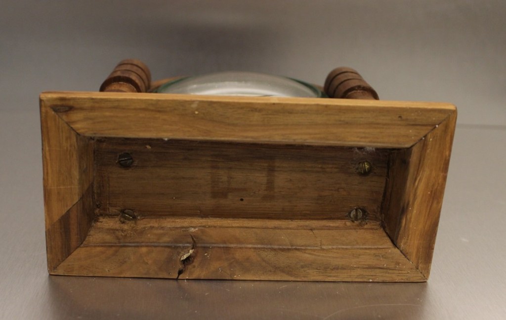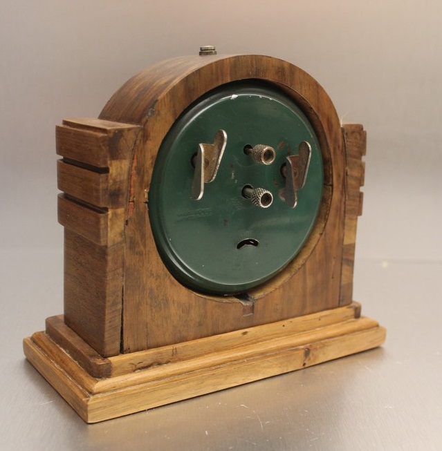 Ce TOURIC en bois est bien à sa place dans cette des hybrides et faux Jaz puisqu’il ne s’agit pas d’une production de la marque au jaseur boréal . Néanmoins , il devrait y tenir une place de choix tant le menuisier a respecté les caractéristiques et les cotes du TOURIC soit 120 x 155 mm , aboutissant à un objet de qualité . D’évidence il possédait un exemplaire original pour réussir cette version bois ; elle est quasiment indestructible , contrairement à la bakélite d’origine dont on sait combien elle cassante et fragile , ce qui explique sans doute ce travail . Le cadran , les aiguilles et surtout le corps emboîté – caractéristique spécifique à ce seul modèle – sont ceux d’un PUBLIC disponible de 1939 à 1940 qui a été peint en marron pour s’harmoniser avec le corps en bois
