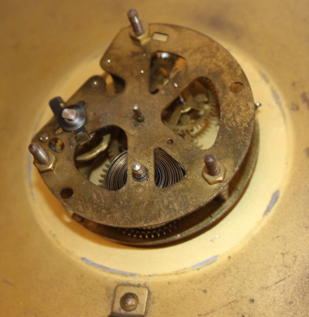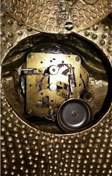 Mais pour comble de l’absurde , c’est un calibre D qui dote cette merveille d’une autonomie de 30 heures ; il faudra donc tous les jours retourner l’ensemble et dévisser le dos pour accéder aux clefs …inaccessibles en raison de l’encastrement du mouvement . En même temps , on aurait mauvaise grâce à être exigeant pour un prix si attractif . Vous noterez que l’animal est astucieux puisqu’il a boulonné une cloche à l’angle du calibre D et tordu le marteau pour qu’il sonne tout de même , étant que notre génie créatif a inventé le réveil de cheminée