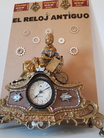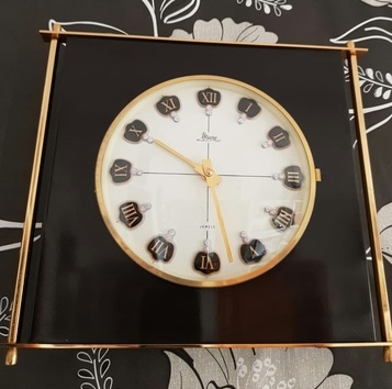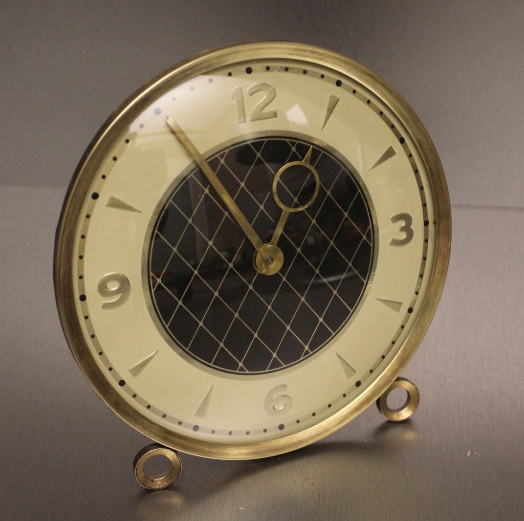 On comprend mieux que les sites de ventes , comme eBay, aient totalement interdit l’ivoire à la vente ; au point que la simple évocation de la couleur ivoire , pour n’importe quel objet , vous vaudra un rappel comminatoire du site de vente avec suppression de votre annonce, voire une suspension du compte : mieux vaut parler de couleur beige ou crème , serait ce pour une automobile dont on sait qu’il en existe des milliers en ivoire massif .Nous vous avons déjà conseillé pour d’autres Jaz , non répertoriés sur Jazlebontemps , d’observer l’objet de dos et d’apprécier le niveau de finition au verso de l’objet . Pour celui- ci , deux choses sautent aux yeux : la profondeur d’encastrement rend très difficile le remontage du mouvement ; ensuite il n’est pas d’usage de mettre un réveil sur un objet décoratif de cette importance , la fonction réveil n’ayant guère de sens dans un salon . Un mouvement de pendulette , n’ayant que la fonction de donner l’heure est largement suffisant et de préférence celui ci aura une autonomie de huit jours . Pour ce Jaz de fortune , il faudra déplacer l’ensemble tous les jours et se tordre les doigts afin de le remonter. Finalement le meilleur moyen sera donc la datation grâce au METRIC . En supposant que le réveil Jaz soit d’origine , celui-ci date de 1953 à 1957 . D’ailleurs le style du décor correspond tout à fait à cette période de la fin des années 50 et plutôt à la fin du style moderniste qu’à de l’Art Déco . Cet ensemble est donc STRICTEMENT interdit à la vente, en raison de la date et de la proportion d’ivoire en pourcentage , sans dérogation possible et sans regrets eu égard au résultat affligeant avec ce petit éléphant , à gauche et bien gauche -par un navrant double zeugma – destiné à rappeler que la plaque est en ivoire et signé le crime . Esthétiquement , l’effet aurait été plus élégant sans cette verrue pachydermique et eut été plus écologique et éthique , en employant du pollopas ou de la galalithe , à base de lait .