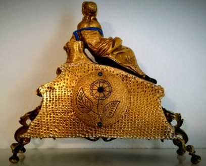 Comme rien ne le gêne , il affuble une horloge dorée dûment customisée de chouettes argentées en guise de cassolettes, pour la modique somme de 1.500 €, une affaire à ne pas rater …