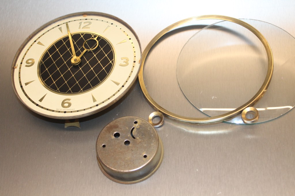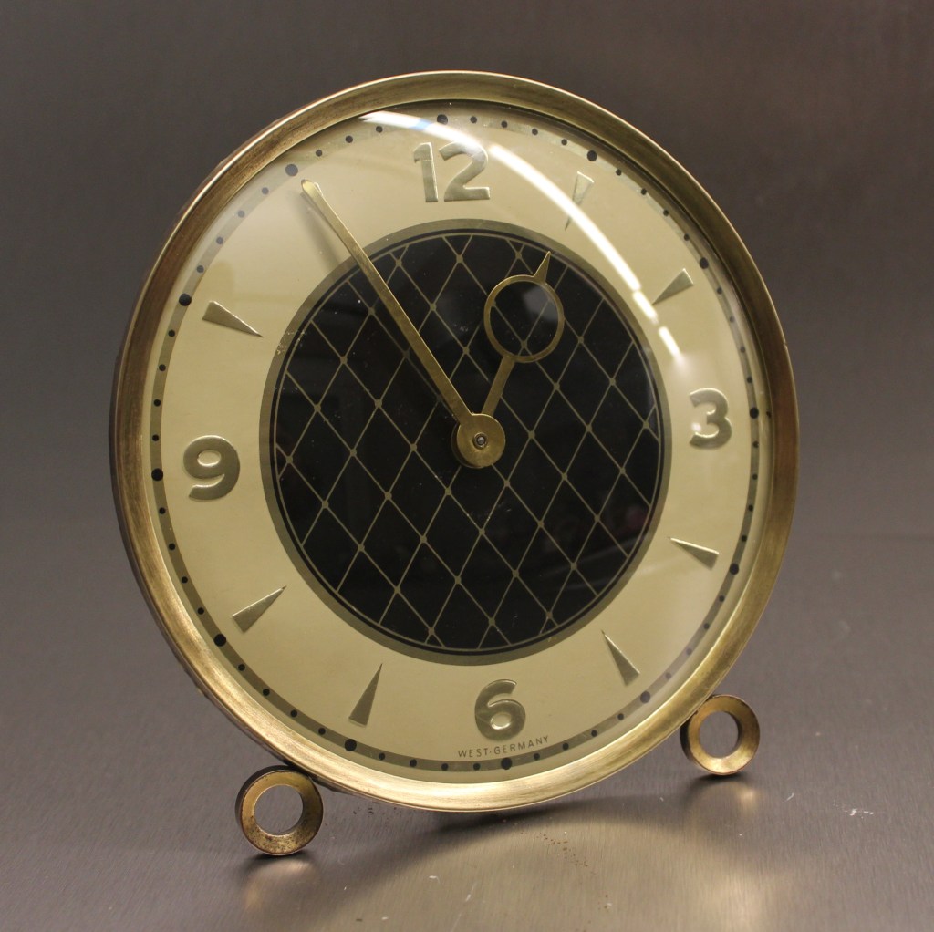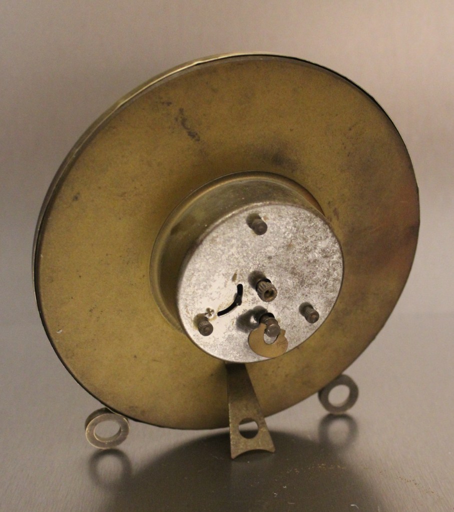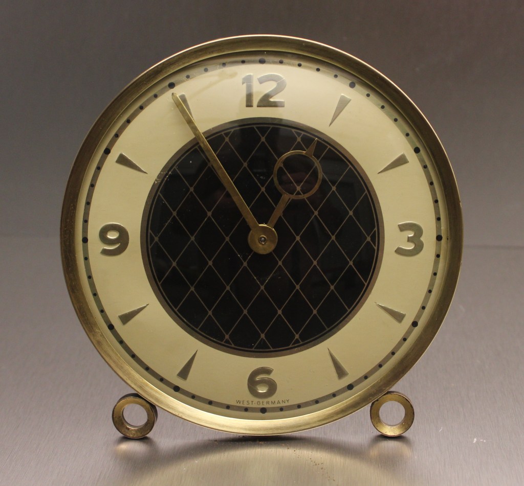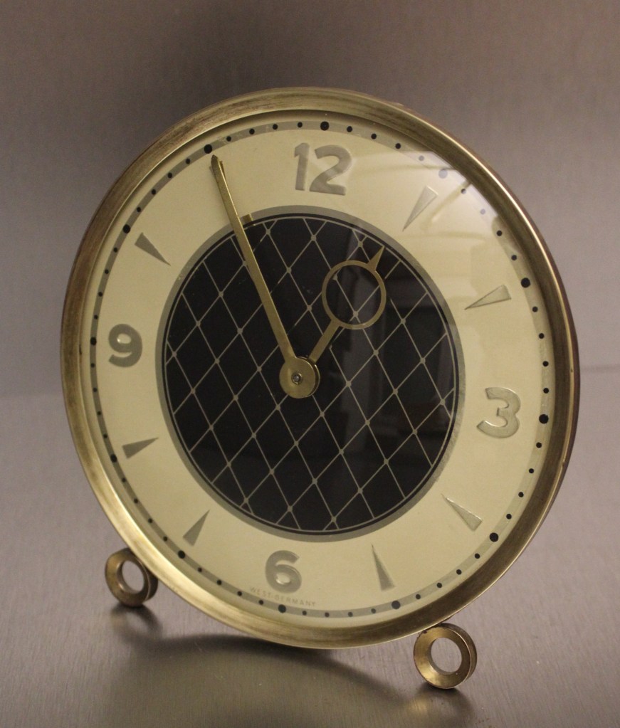 Horloge à poser made in Germany, sans marque . Les photos sont suffisamment parlantes pour qu’il soit inutile de démontrer combien ce fabricant – qui a bien fait de rester anonyme- à trouver son inspiration, à la limite du plagiat, dans le CENTRIC à gauche et le BOULIC à droite. Toutefois, tout est revu à la baisse, sauf le format quasiment similaire, puisque ce croisement – pour ne pas dire bâtard- germanique ne cède qu’un seul centimètre sur son diamètre de 15 cm. La vitre bombée est en verre, elle assure la majorité du poids de 300 gr , marquant une différence de plus de 200 gr avec les deux Jaz qui sont beaucoup mieux finies et donc nettement plus lourdes. Le cadran n’est pas en métal comme les Jaz qui l’ont inspiré mais en simple carton ; le cerclage qui fait office de lunette est si fin qu’il n’est pas possible de démonter l’horloge sans le déformer ; pas de pieds-boules visés mais deux cercles rivetés et mal proportionnés . Dos et cache-mouvement sont en métal blanc peints en doré en lieu et place du laiton massif des CENTRIC et BOULIC. Si l’on retrouve une aiguille pontife pour l’heure, celles -ci sont très peu épaisses . Mais c’est dans le mouvement que la différence se creuse le plus , puisqu’on est loin du calibre K , 7 pierres et ses 8 jours d’autonomie qui animent nos deux pendulettes Jaz ; Effectivement un mouvement trente heures bien prosaïque dote cette pâle copie d’outre-rhin .