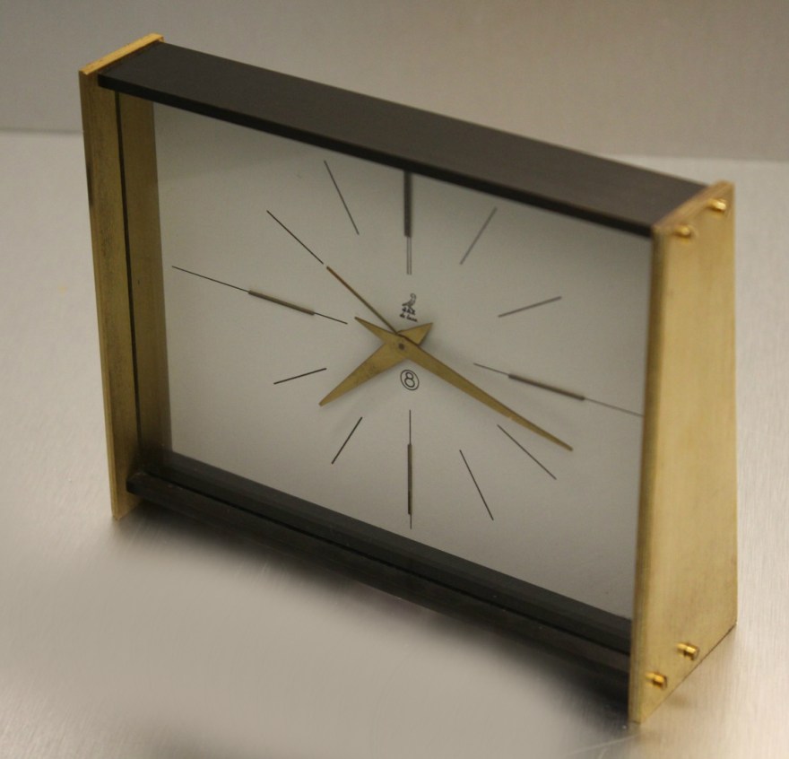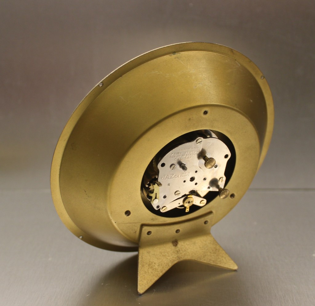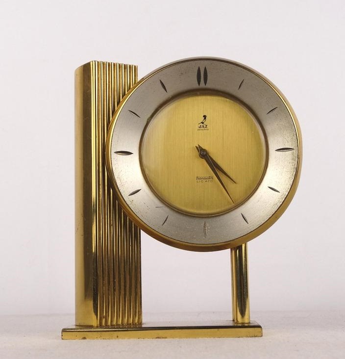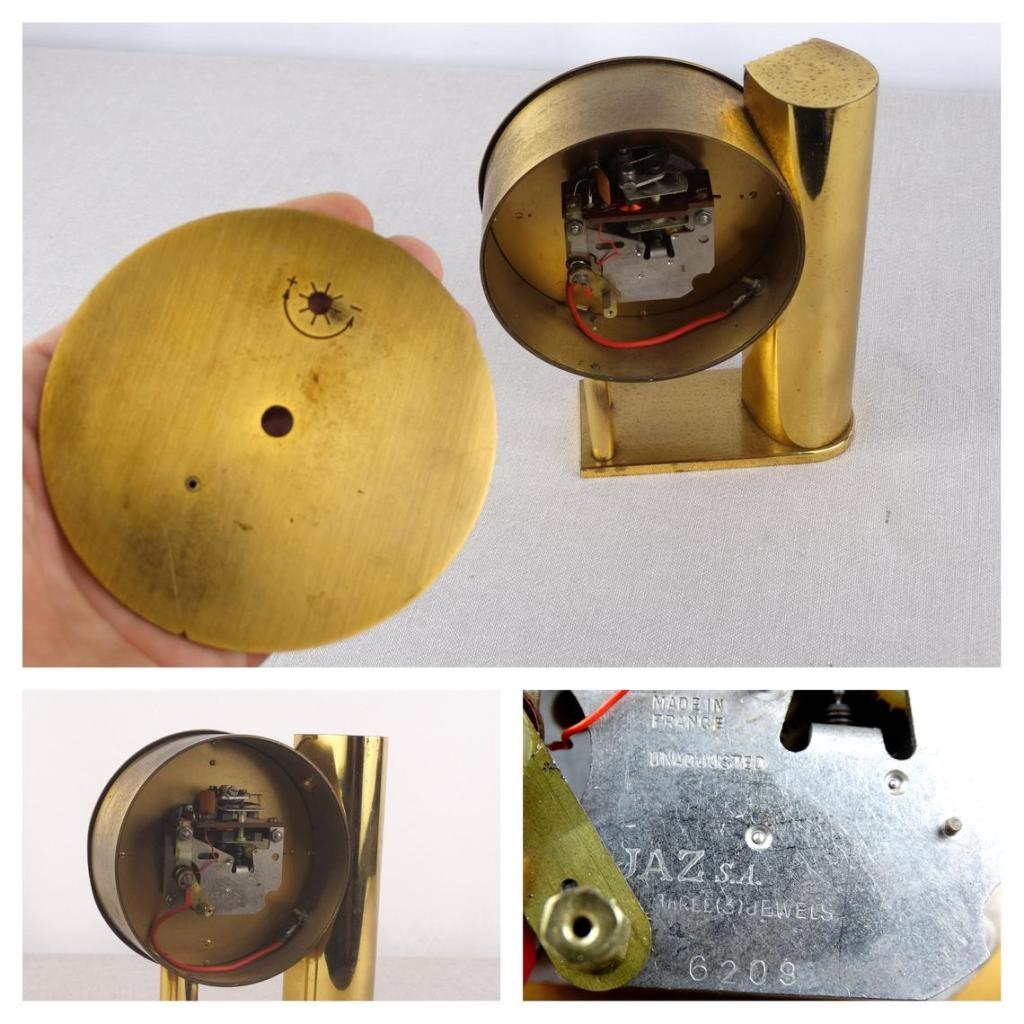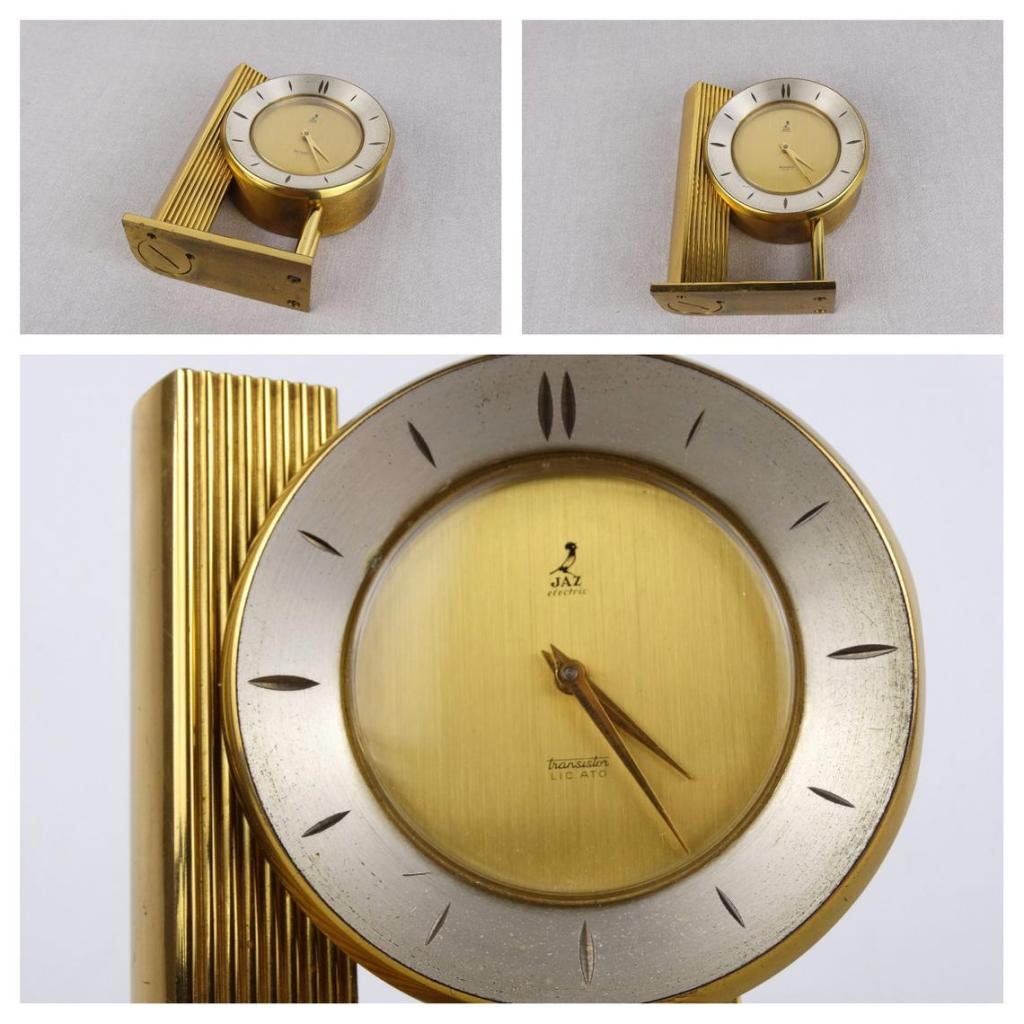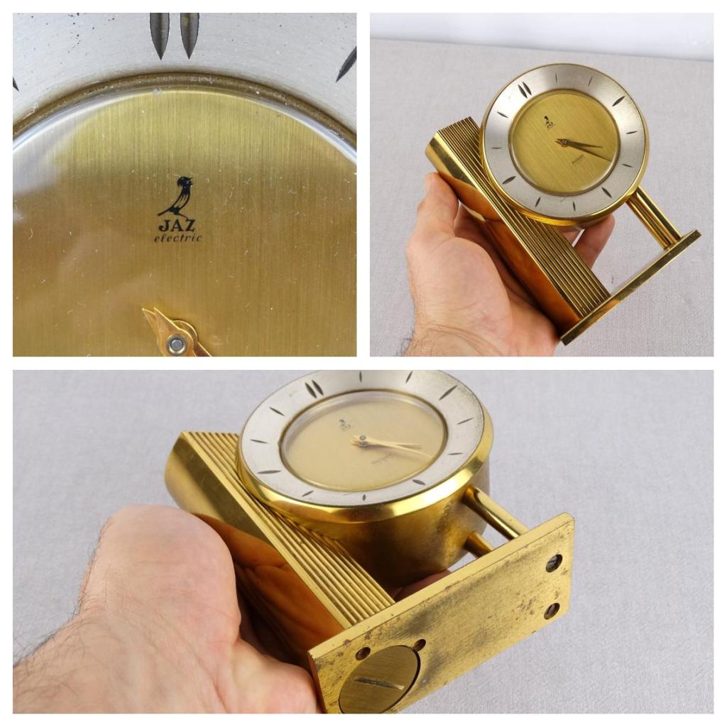 Pendule à poser , gamme Jaz Electric et gamme Jaz Transistor , mouvement à pile LR14 , calibre AN , licence ATO . Pas de chiffres mais des index , incisés en creux , sur une couronne extérieure d’un diamètre de 10 cm , vitre légèrement bombée en plexiglas , cadran métal doré brossé , aiguilles dauphines , aiguilles non-lumineuses . Le calibre est daté de 1964 et les deux autres exemplaires que nous connaissions sont datés de 1962 , néanmoins cette horloge n’apparaît pas dans les catalogues français de cette période : il s’agit donc très probablement d’un modèle réservé à l’export . Hauteur 14,5 cm pour un poids 1,245 kg sans la pile .