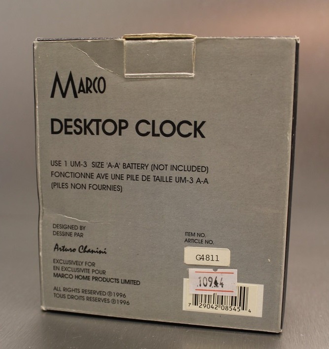 Madame GLUBE, réveil, corps en plastique, nouveauté du catalogue 1997/1998 page 19, version jaune référencée G4811, pas de chiffres mais des index, aiguilles lumineuses, à pile LR6, trotteuse centrale rouge, format 11 x 10,5 x 4,5 cm, poids 155 gr sans la pile. Marco Home Products Limited est une entreprise hongkongaise, fondée en 1990, qui produit des produits de maison de haute qualité avec un design contemporain: des ustensiles de cuisine aux minuteurs. Le design de ce réveil est attribué à Arturo Chanini qui semble être une entité fictive recouvrant un bureau de stylisme. Voir la version rouge .