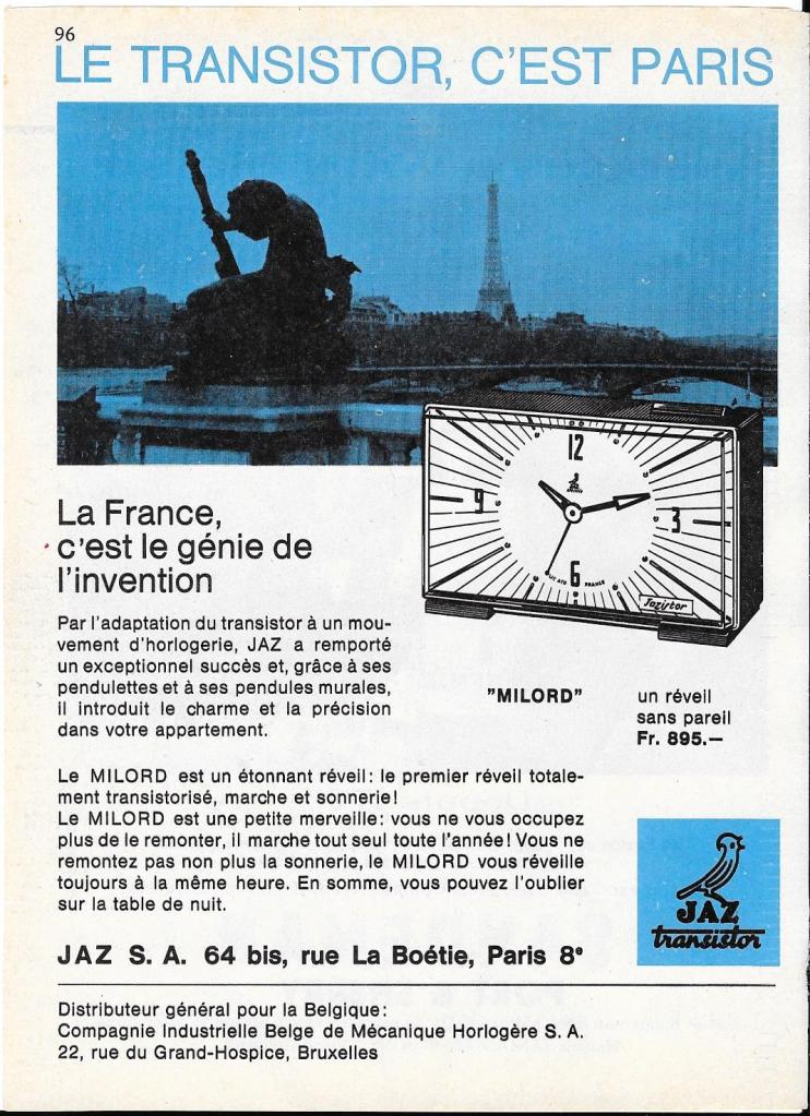 Il en est de même pour certains réveils , telle cette version du MADRIC en livrée verte , hors catalogue en France mais dont nous connaissons trois exemplaires, issus de notre collection et de celle de Marc Barat , achetés en Grande Bretagne . Cette horloge murale , là encore spécifique au marché anglais , arbore un cadran entièrement vert , qui n’a pas d’équivalent sur le continent . Revue Vendre du 1° Juillet 1956 . Ce petit entrefilet dans cette revue professionnelle , spécialisée dans la publicité , prouve que Jaz savait s’adapter à ses différents marchés . Jaz Clock Co Ltd filiale implantée à Londres , dès les origines de la marque Jaz en Angleterre , était tout à fait capable de déterminer les choix à faire pour séduire la clientèle britannique .