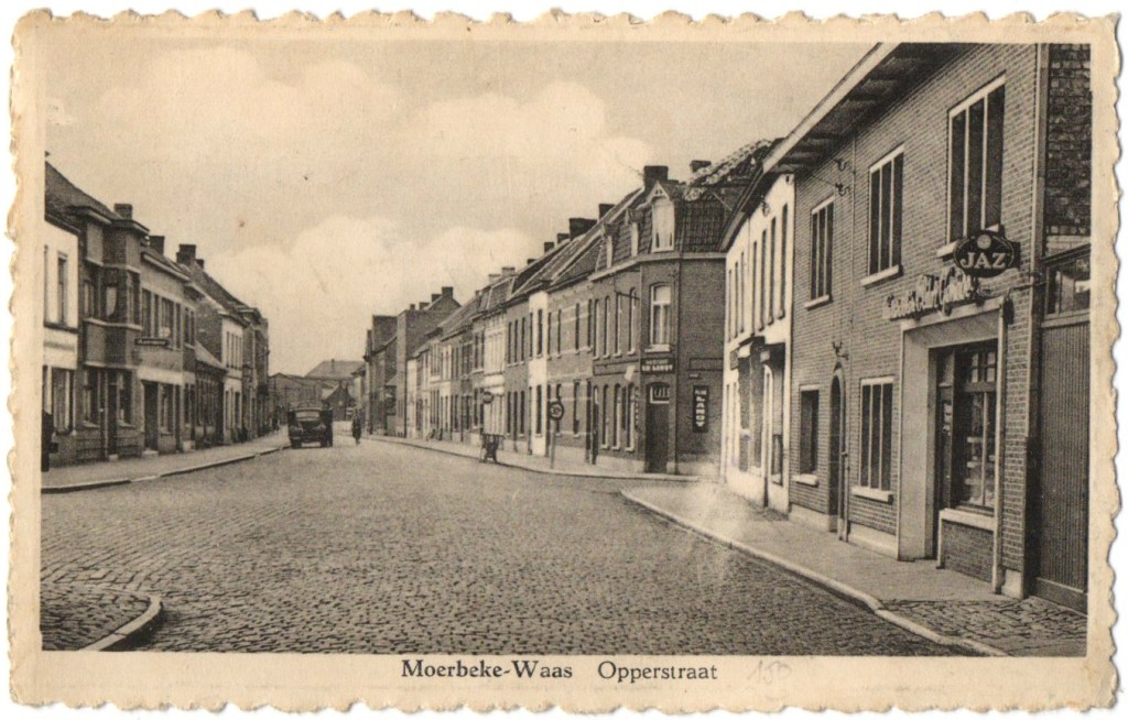 Photo sépia 9 x 4,5 cm ; L’HORLOGERIE SUISSE : le nom du propriétaire , en blouse blanche , se trouve en travers sur la porte vitrée ; juste derrière sa tête , on peut lire V ou W DECOSTER FESINETS . Hélas le patronyme Decoster , qui signifie sacristain , étant extrêmement répandu en Belgique , nous n’avons pu localiser cette petite horlogerie. Le plus étonnant reste ce store banne publicitaire dont nous ne connaissons aucun autre exemplaire ; en revanche le slogan est bien connu : JAZ le réveil de précision ; L’ensemble de ces éléments permet de dater cette photo entre 1921 et 1925 .Vitrine détail : A la plaque émaillée est très en biais , néanmoins on arrive tout de même à l’identifier B collées sur la vitrine deux plaques rectangulaires C un des surmontoirs en forme d’éventail posé sur un réveil Jaz , il y en a une bonne dizaine sur cette étagère et d’autres sur l’étagère du haut .Carte postale Moerbeke-Waas , Oppertstraat .