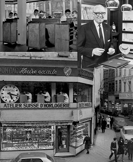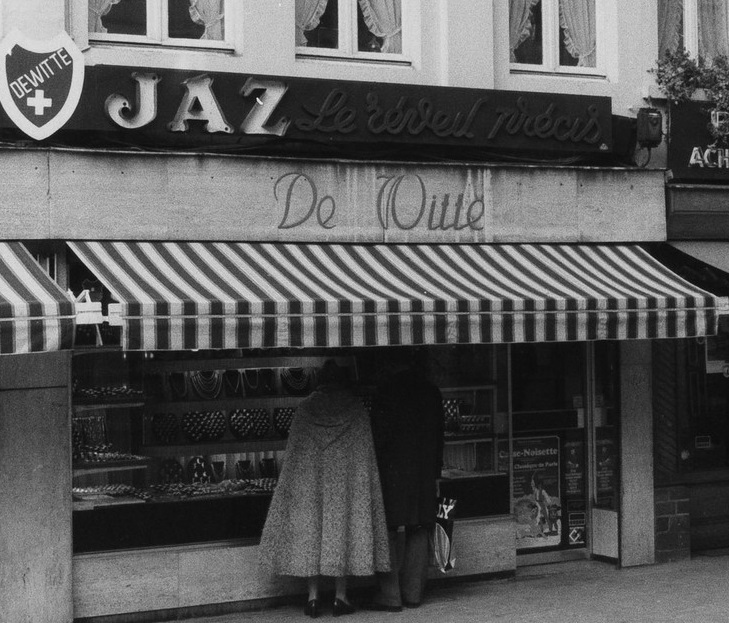 Bijouterie Horlogerie De Witte, photo prise en 1981, Petite Rue au Beurre à Bruxelles, numéros 13/15 et 17. Les publicités en façade se partagent entre PONTIAC pour les montres et JAZ pour les réveils et les horloges.L’enseigne lumineuse Jaz, arbore le slogan Le réveil précis en néon.De jour, le slogan Le réveil précis est peu lisible De nuit l’enseigne est éblouissante et surmonte un rideau de fer peint aux couleurs de Jaz; Nous ne connaissons pas d’autres exemples de ce type de support publicitaire pour la marque Jaz, vous noterez qu’un Manneken-Pis orne le panneau pour Pontiac.De Witte occupait les deux côtés de la Petite Rue au Beurre assurant une belle visibilité pour Jaz en plein centre du Bruxelles historique et touristique.Photo extraite du site de la Maison de Witte qui prospère encore de nos jours. Fondée en 1932 par Paul De Witte, elle est une des plus anciennes et une des rares horlogeries indépendantes bruxelloises ainsi qu’une véritable institution locale, en raison entre autres , de ses multiples boutiques dans la capitale belge. La maison De Witte démarre rue de l’Eglise à Shaerbeek, puis passe à Forest rue des Alliés avant de gagner Bruxelles. En 1958 lors de l’Exposition Universelle, où Jaz recevra une médaille d’or, Nicole de Witte rejoint son père dont l’entreprise sera dirigée pour les trois générations suivantes par des femmes. De Witte fait sa publicité et celle de Pontiac, grâce à ces maillots jaunes dont la Belgique regorge. Ils organisent ensemble un Rallye Pontiac dans les rues de Bruxelles et des jeux-concours dans les revues du Benelux dont les bulletins de participations remplissent des dizaines de sacs postaux.Photo extraite du site de la Maison de Witte : à droite Monsieur Paul de Witte; à gauche et en bas: la deuxième boutique de l’autre côté du bout de la Petite Rue au Beurre avec ses horlogers réparateurs à leurs bureaux accolés aux grandes baies vitrées. Ces ouvriers assuraient également la création ou transformation de bijoux et la gravure des montres et bijoux. Cette dernière activité reste de nos jours une spécialité de la maison qui fournit aux grandes administrations belges des montres personnalisées en guise de cadeaux officiels. Pontiac, dont on voit la grande horloge publicitaire à l’étage, est une marque suisse de montres, dont nous résumons l’histoire en fin d’article.Photo extraite du site de la Maison De Witte: toujours très au fait en matière de communication, le bijoutier assurait de nombreuses animations devant ses boutiques.Acculée à l’Eglise Saint Nicolas, il existait depuis le XIX° siècle un horloger bijoutier à l’emplacement qu’occupera De Witte qui consistait en une boutique informe, juste en rez de chaussée sans étage.L’horloger Diericx est le premier occupant du nouveau bâtiment d’angle de style baroque, même si le terme nouveau est peu approprié pour une construction datant du début du XVIII° siècle.Cette Petite Rue au Beurre, qui donne dans la rue au Beurre laquelle aboutit directement sur Grand Place , sera toujours la rue des horlogers bijoutiers , on remarque la boutique Mornard avec sa grande enseigne Lip . De Witte finira par annexer cette petite boutique à sa gauche mais on aperçoit une horloge publique qui fait office d’enseigne d’un autre horloger . Enfin l’autre côté de la rue comprenait d’autres horlogeries, dont l’angle de rue occupé par les ateliers-boutique De Witte .une horloge Oméga remplacera celle de Pontiac Dans les cartouches à fonds bleus, visibles en façade, on peut lire DE GOUDE HUYVE qui donne son nom à cette maison classée Monument Historique. Dès le Moyen Âge, la domonymie était une tradition, à Bruxelles comme dans de nombreuses villes européennes, qui consistait à donner un nom servant à identifier une maison. Celle-ci avait été initialement construite rue de l’Étuve, juste après le bombardement de Bruxelles pendant 48 heures d’affilée par les troupes françaises de Louis XIV en 1695, qui obligera à reconstruire quasiment entièrement Bruxelles.