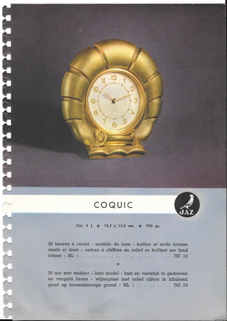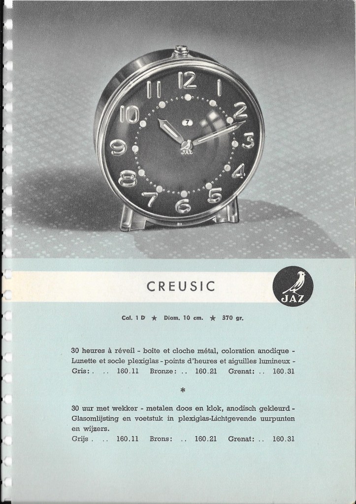 Ce catalogue 1981/1982 n’est pas la version en langue espagnole du catalogue Jaz français de 1981 ou 1982 ; En France il y a une édition par année destinée uniquement aux professionnels revendeurs ; Il s’agit d’une publication tout à fait originale et spécifique au marché espagnol qui présentait la particularité d’avoir une usine Jaz sur son territoire . Les réveils français ont des dénominations se terminant en -IC ; à part quelques exceptions pour des modèles prestigieux vendus en Italie et Belgique , les jaz étrangers n’ont pas de noms , que des références .page 1 : Etrangement ce catalogue commence par les horloges murales , c’est exactement l’inverse en France ; la 1021C ressemble fort à une CALIC , en plus petite de 6 cm ; la référence 1006 est spécifique à l’Espagne page 2 ; la 273 à dateur est une variante de la PRATIC que Jaz a vendue à Bulova et vendue en Allemagne sous la référence 208 avec d’autres couleurs ; la 207 en est la version sans dateur , non distribuée en France ; 2136 cette horloge n’a jamais été vendue en France, pas plus que la 2001 .page 3 ; sur cette page les assiettes et les références 2011 et 2703 sont endémiques , les autres sont des horloges identiques aux exemplaires français où présentant des toutes petites variantes par rapport à eux . page 4 ; En revanche sur cette page tout est réservé au marché espagnol . page 5 ; même constat sur cette page qui ne présente que des horloges espagnoles .page 6 ; là encore tout est strictement espagnol ;page 7 : aucune de ces horloges n’a été distribuée en France ;page 8 : on constate qu’aucune de ces horloges n’est disponible en France à l’époque , esthétiquement sans regrets .page 9 : encore une fois toutes ces horloges sont uniquement « espagnoles ».page 10 : pas de versions françaises sur cette page 10 ; page 11 : pas d’exemplaires distribués en France sur cette page 11 ; page 12 : il est de même pour cette page toute espagnole .page 13 : si toutes ces pièces sont réservées aux ventes en Espagne , pour une fois on le regrette pour ces radios réveils assez élégants ; page 14 : malgré d’apparentes similitudes aucun de ces réveils ne verra le sol français ; despertadores = réveils en français ; ces lots de six réveils sont effectivement réservés aux horlogers espagnols . Rappelons que les catalogues Jaz , français ou espagnols , ne sont pas destinés à la clientèle particulière ;page 15 : présentés en haut de page par lots de seize réveils , ils sont détaillés en dessous permettant de nous assurer qu’aucun d’entre eux n’a été vendus en France ; page 20 : en revanche sur cette page , tout avait été précédemment disponible en France à part le 169 variante du POPIC de 1976 ; 1349 CLANIC ; 1397 SCINTIC ; 1317 CORSIC , 1346 DACRIC disparu en France en 1976 ; 165 LOPSIC ; 1331 VERTIC ; 1321 retour du CLODIC sept ans après sa suppression en France avec un cadran blanc ; 1320 DOCLIC qui avait été arrêté en France en 1978 .page 21 : 1370 DARCIC , 1338 CARDIC , 1323 NICLIC ; ;