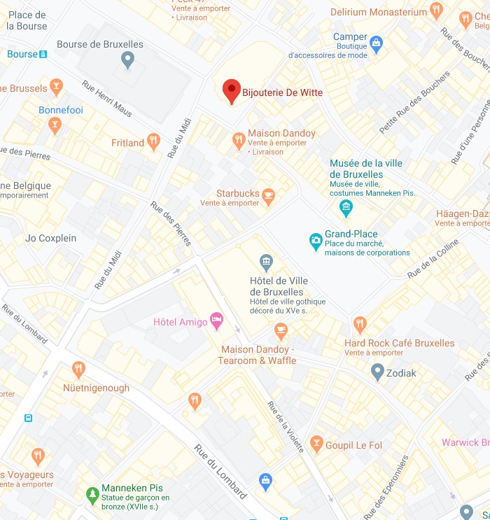 Plan de Bruxelles positionnant la Bijouterie De Witte par rapport à la Bourse à gauche ; au centre droit on trouve Grand Place , la place centrale de Bruxelles mondialement célèbre, et tout en bas la fontaine du Manneken Pis.
