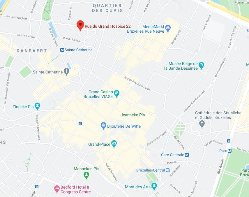 Le siège de Jaz Belgique, au 22 rue Grand hospice se trouvait donc dans le quartier central de Bruxelles , proche de celui des Quais. Au centre de la carte, la célèbre bijouterie De Witte, à laquelle nous avons consacré un long article illustré en tant que distributeur historique de Jaz à Bruxelles.