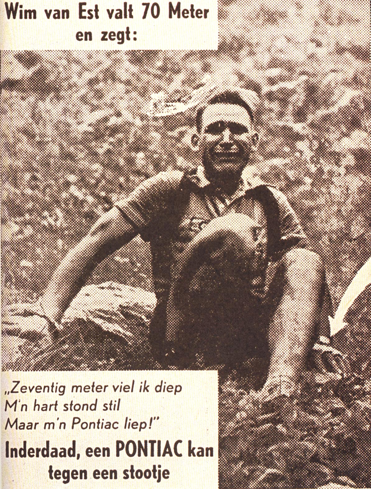 Pontiac est une marque d’horlogerie qui a connu un succès particulier chez nos voisins d’outre-Quiévrain, parce que son importateur, le néerlandais Ali Kinsbergen, était propriétaire de la marque en Belgique et aux Pays Bas si bien. Elle a été ressentie comme une marque locale puisque le siège social était à Bruxelles . Néanmoins et contrairement à certaines affirmations, il n’y eut jamais de fabrication de Pontiac à Gand ni en tout autre endroit en Belgique, tout était fabriqué et assemblé en Suisse . Le champion Wim Van Est, premier néerlandais à porter le maillot jaune, a vu sa renommée s’accroitre selon une courbe inversement proportionnelle à sa chute vertigineuse lors du Tour 1951, surtout grâce au marketing de circonstance de l’horloger. Effectivement Pontiac, qui avait parrainé l’équipe néerlandaise, a lancé une campagne publicitaire en ces termes au nom du champion cycliste et si résistant « Je suis tombé soixante-dix mètres de haut , mon cœur s’est arrêté, mais ma Pontiac fonctionnait encore ». Une plaque a ensuite été dévoilée sur le site de la chute en 2001 par Wim Van Est devenu septuagénaire.