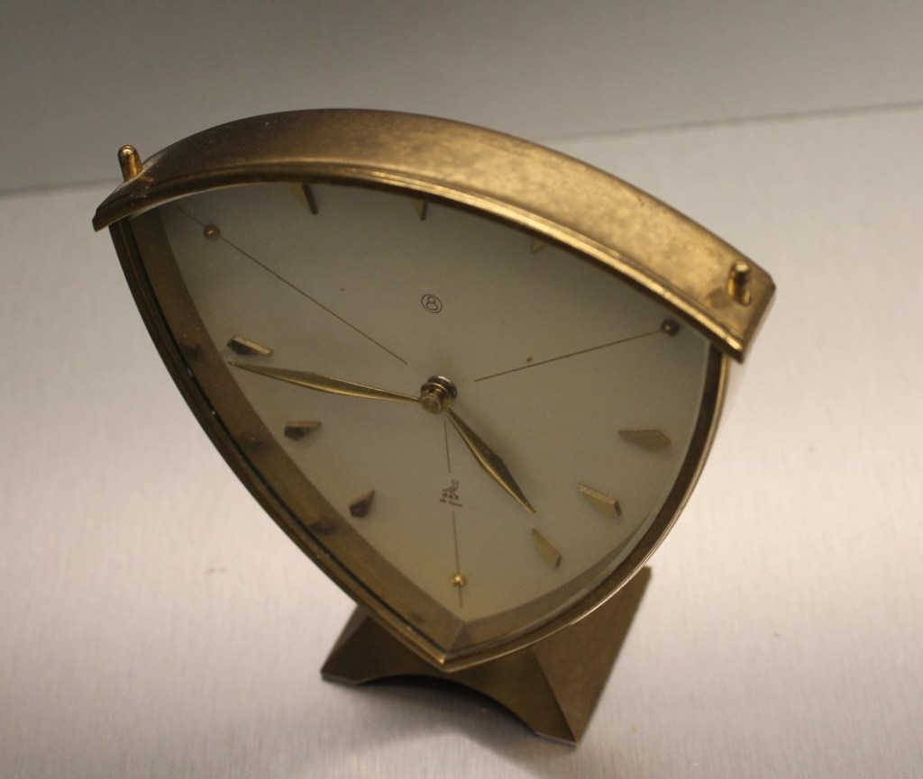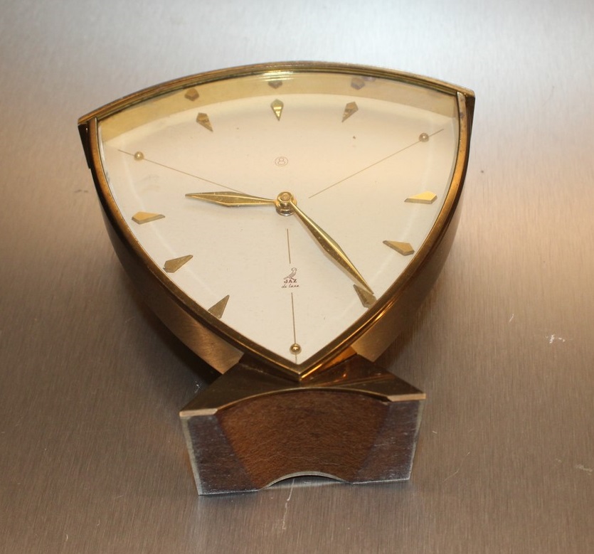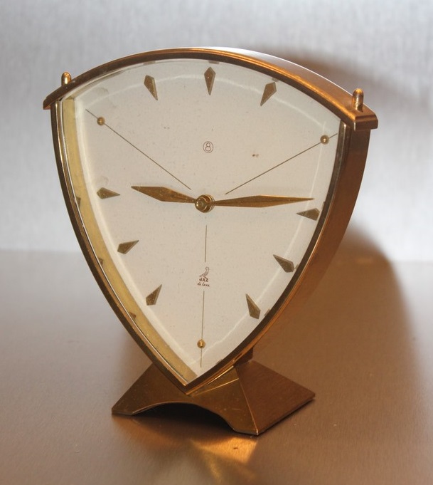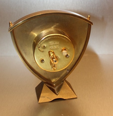 ARMIC , pendulette , gamme Jaz de Luxe , mouvement mécanique , calibre K , autonomie 8 jours , sans fonction réveil . Nouveauté du catalogue 1957 à la page 4 , référencée 844-10 . Boîtier en métal doré , cadran argentée , pas de chiffres mais des index en relief, non-lumineux . Format 13,5 x 12,5 cm , poids 715 gr . Sa forme en écu ou bouclier est à l’origine de son nom d’ARMIC , il n’est disponible qu’aux catalogues 1957 et 1958/59
