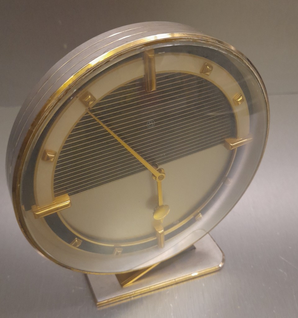 Boîtier et socle argenté mat et doré , lunette dorée , cadran concave , six cercles concentriques dorés et gravés en creux , pas de chiffres mais des index et points d’heures dorés et rapportés , glace biseautée sertie , non lumineux . Diamètre 10 cm , poids 565 gr . Dernière apparition au catalogue 1958/59 .