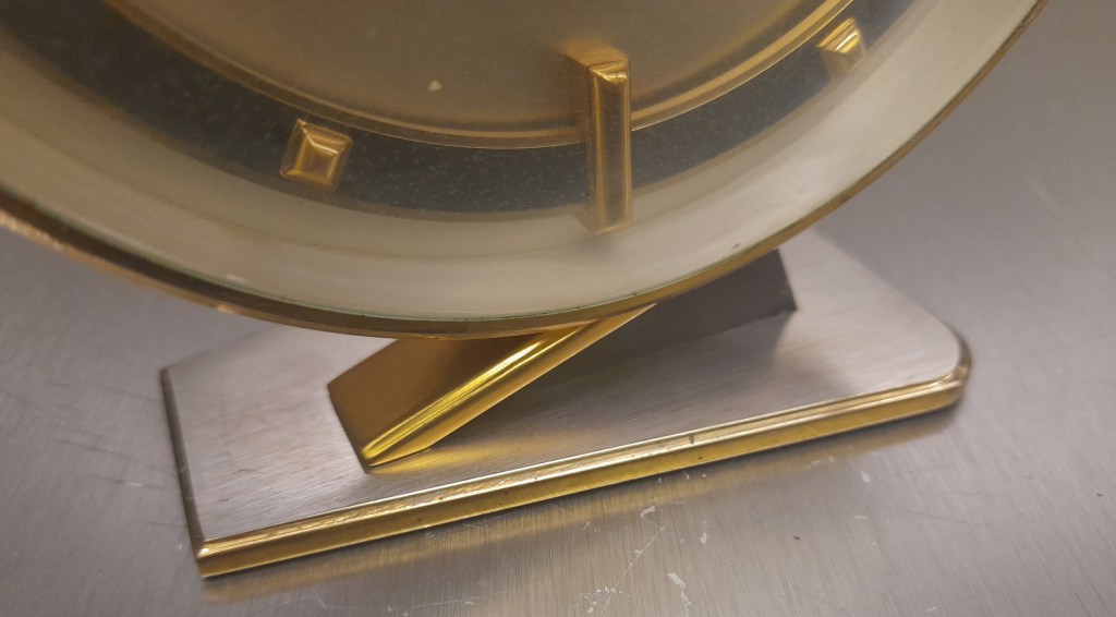 NOCTIC , pendulette , gamme des Jaz de Luxe , mouvement mécanique , calibre K , autonomie 8 jours , échappement à ancre ,7 pierres , sans fonction réveil . Nouveauté du catalogue 1956 à la page 4 , référencée 847-10 . Le 8 dans un cercle est un rappel de l’autonomie de huit jours .Boîtier en métal argenté mat gravé or sur tranche , socle en métal argenté , intermédiaire de socle noir , cadran moitié gris foncé et moitié argenté , zone des heures rapportées argent et noire supportant douze index tenant lieu de chiffres , glace sertie légèrement bombée et biseautée , aiguille pontife pleine pour l’heure , non-lumineux . Diamètre 13,5 cm , hauteur 15,2 cm , poids 800 gr . La NOCTIC n’est disponible qu’aux catalogues 1956 , 1957 et 1958/59 . Sa dénomination de NOCTIC lui vient de nocturne par allusion à son cadran alternant par moitié jour et nuit . ATTENTION le décor argenté est très fragile, avec le temps il s’oxyde, les tentatives de nettoyage aboutissent en général à la disparition de la fine couche d’argenture et l’apparition à la place du laiton doré (voir les deux premières photos)