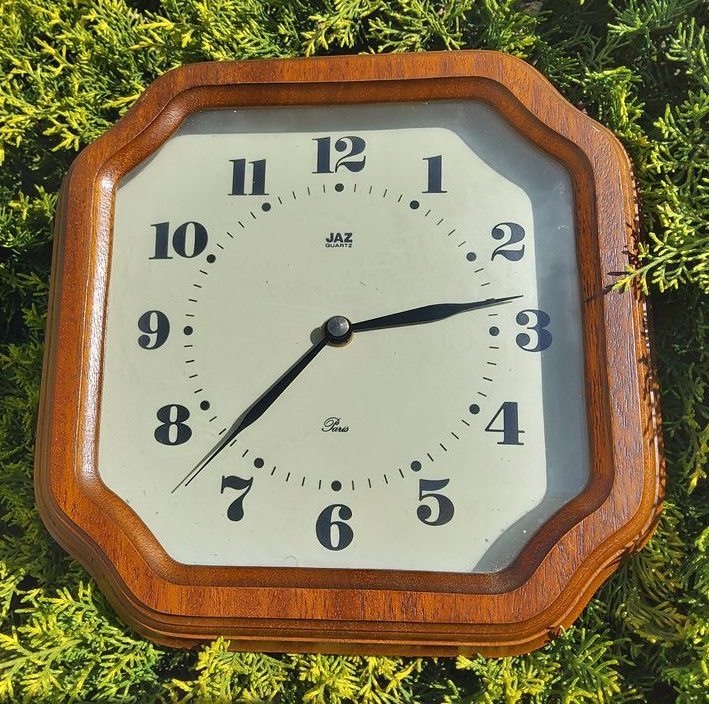 5204 , réveil forme ronde , gamme Jaz Boutique , mention Paris et France en bas de cadran , corps en acier brossé à décor en laiton doré , aiguilles noires , aiguilles et points lumineux , chiffres Breguet , arrêt de sonnerie au dos , quartz , à pile bouton LR44 , présent uniquement au catalogue 1985 page 5, diamètre 7 cm
