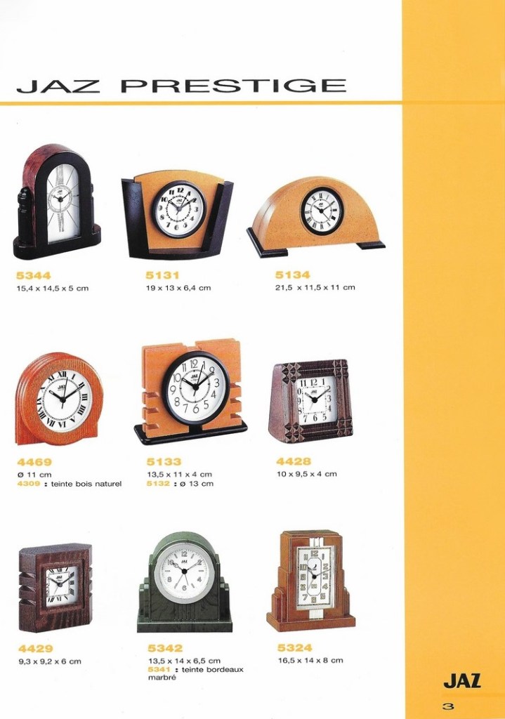 5121 , très grand réveil portique , en médium teinté , gammes Jaz Quartz et Jaz Prestige , cadran blanc à chiffres romains , aiguilles bâtons squelettes , non-lumineux , sans trotteuse, mouvement quartz à pile LR6 , chemin de fer à l’intérieur de la zone des chiffres , hauteur 27,5 cm x 20 cm x 6 cm , poids 1,450 kg , nouveauté du catalogue 1991/1992 à la page1 , disponible jusqu’au catalogue 1993/1994 ;