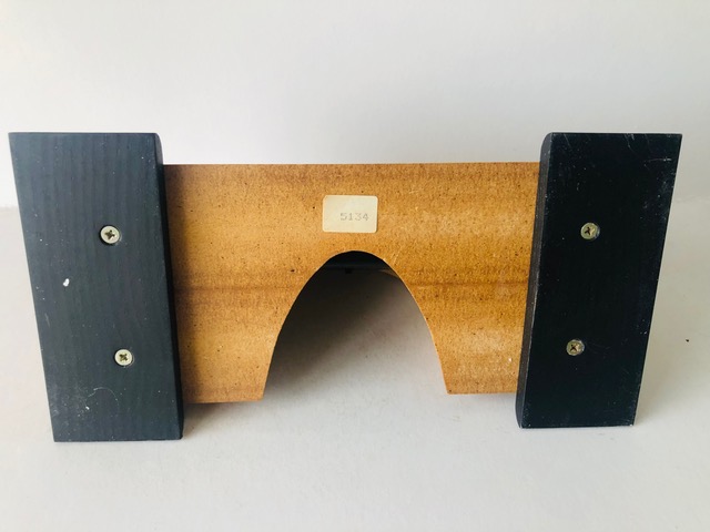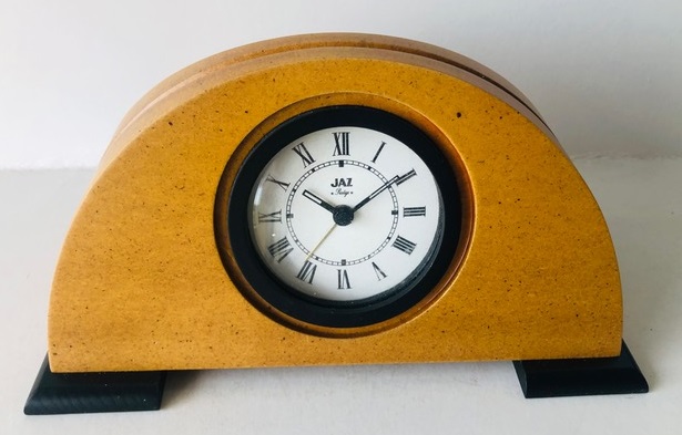 5134 réveil , gamme Jaz Prestige, quartz à pile LR6, forme demi-lune, corps en bois, chemin de fer rond à l’intérieur de la zone des chiffres romains, format 21,5 x 11,5 x 11cm, disponible de 1991 à 1994