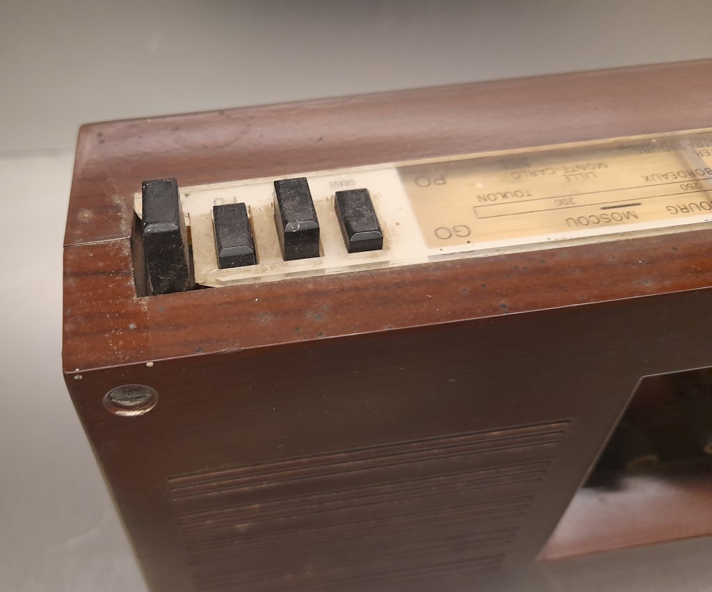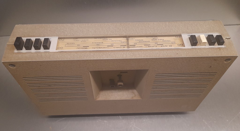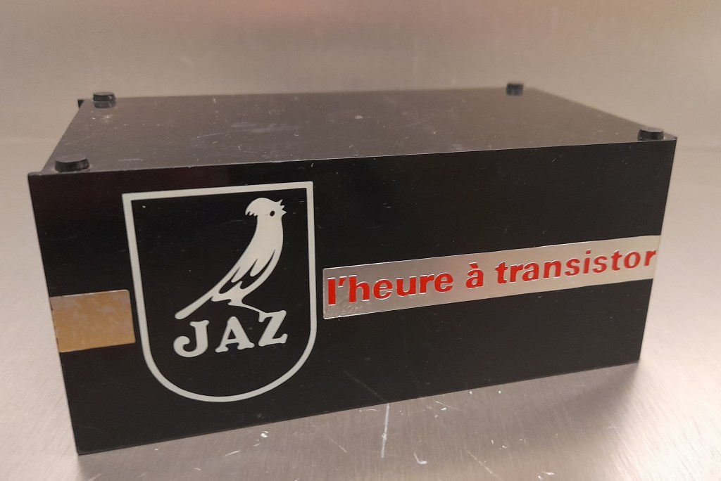Commentaires : Radio-réveil , réveil électrique. Présentation pendule Jazistor plus étroite que le Jaz, laissant la place à une grille haut parleur de chaque côté mais il y a un seul haut parleur à droite du réveil . Existe également sous la marque « La Voix de son Maître » nommé Horophone (façade différente). Réveil par la radio ou le « buzzer » du Jaz ( source DOCTSF) .