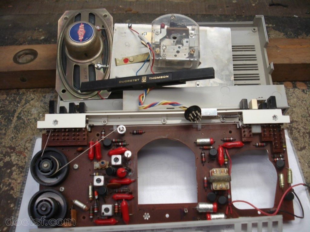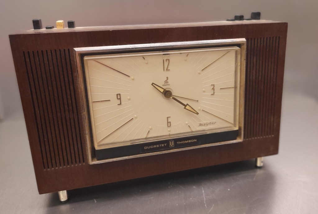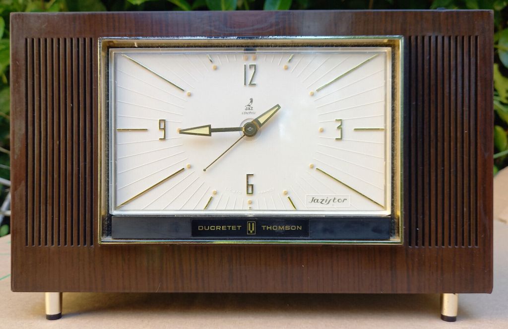 Radio- réveil DUCRETET-THOMSON , réveil sur base du DRILIC des gammes Jaz Electric et Jazistor , six piles LR14 pour la radio et l’éclairage du cadran ; une pile LR14 pour le réveil . Hors catalogue Jaz , était vendu par les magasins de radio et télévisions Fonctions : radio réveil à huit semi-conducteurs