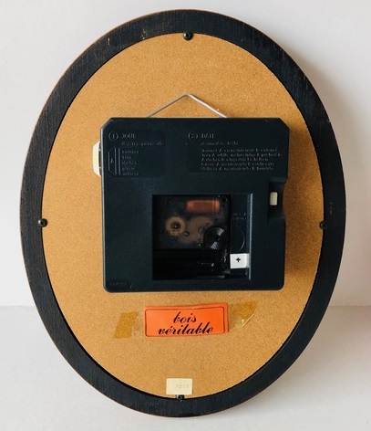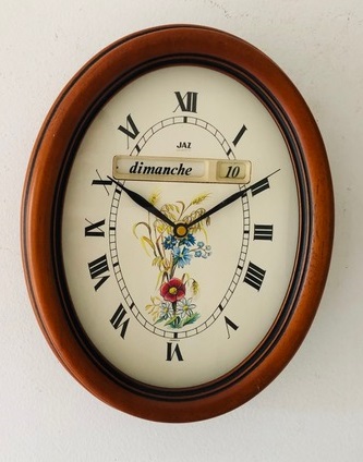 7213 horloge murale à dateur jour et date, corps ovale en bois , mouvement quartz à pile LR6, chemin de fer ovale à l’intérieur de la zone des chiffres romains , aiguilles feuilles noires, décor floral sur cadran émaillé nouveauté du catalogue 1990 dans « Les Naturelles » disponible jusqu’en 1992 . Format 28 x 22 cm