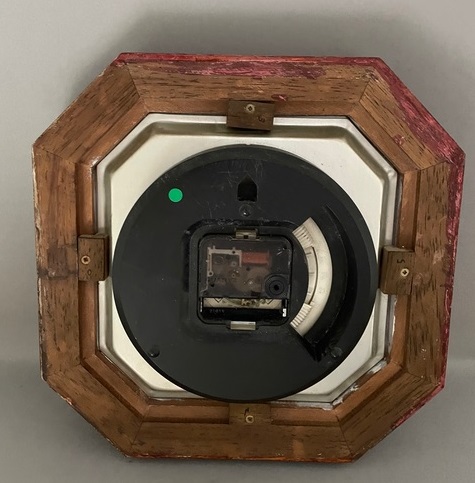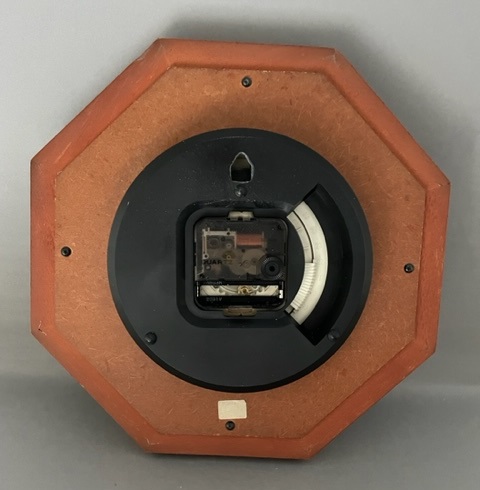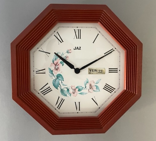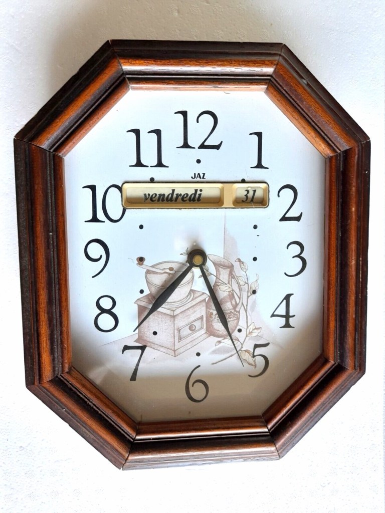 7225 Horloge murale en bois de forme octogonale , gamme Jaz Quartz , mouvement quartz à pile LR6, cadran blanc en métal, à dateur jour et date , aiguilles feuilles noires , nouveauté du catalogue 1992 disponible jusqu’en 1995. Format 26 x 26 cm. Pile LR6