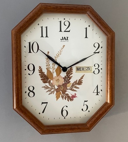 7227 ,horloge murale, gamme Jaz Quartz , à dateur jour et date , en bois forme octogonale , à décor floral de véritables fleurs peliprotégées -fleurs collées et protégées- ( le décor varie donc légèrement à chaque horloge ), chiffres romains , chemin de fer allégé à l’extérieur de la zone des chiffres , aiguilles feuilles noires, mouvement quartz à pile LR6. Format: 26,5 x 21,3 x 4,7 cm , nouveauté du catalogue 1993/94 page: 59 présente jusqu’en 1995 .