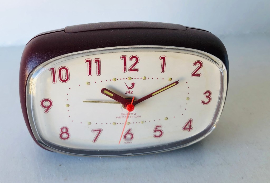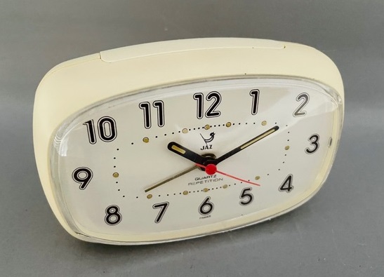 RUMIC , réveil de la gamme Jaz Quartz , mouvement électrique à pile LR6 , trotteuse centrale , arrêt de sonnerie au sommet , sonnerie buzzer . Nouveauté du catalogue 1983 .Boîtier en plastique , aiguilles et points lumineux , éclairage du cadran par un grand bouton en façade à droite , sonnerie à répétition et progressive . Référence 8437-11 en blanc et 81 en brun . Format 10,4 x 7,9 x 4,5 cm .