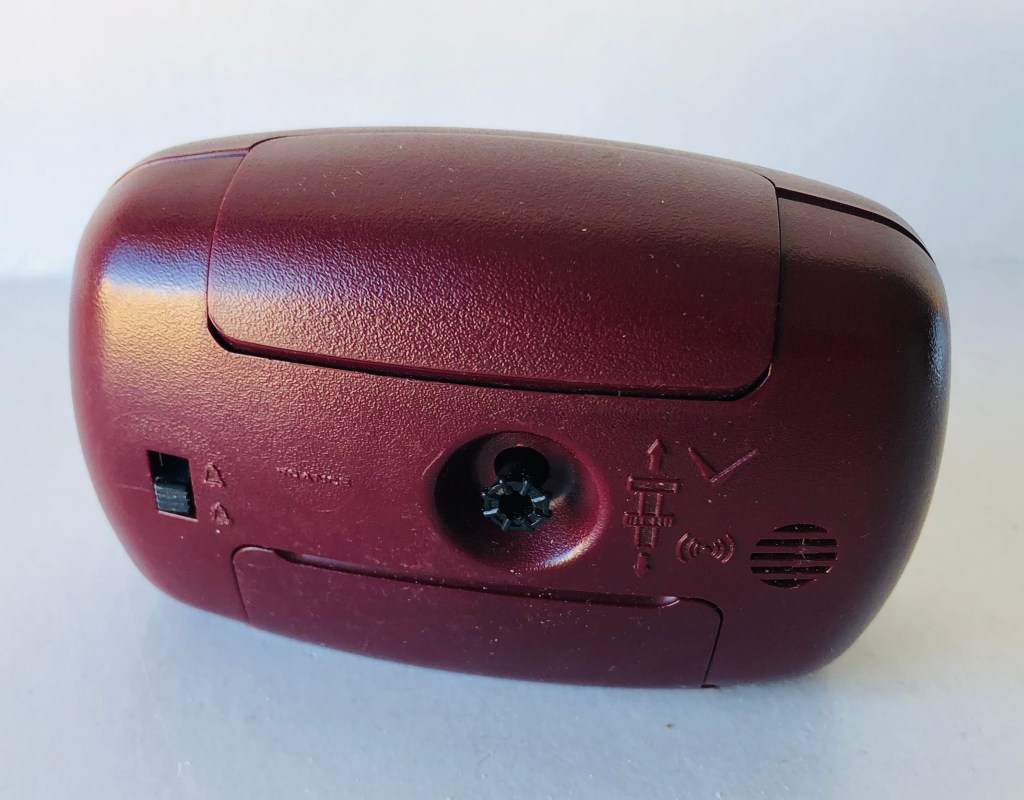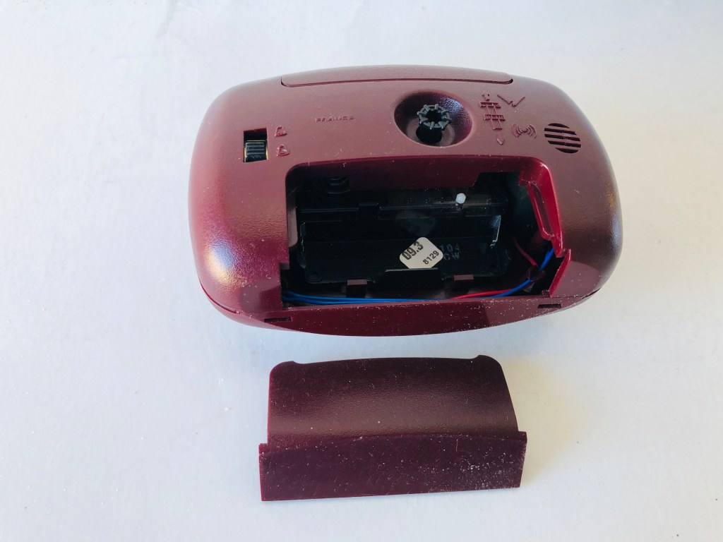 Petit réveil radio-piloté, affichage analogique et numérique, éclairage du cadran, corps en plastique, à deux piles LR6, arrêt de sonnerie au sommet, sonnerie répétitive et progressive, nouveauté du catalogue 1997/1998 à la page 23 référencée G5682, format 9 x 8 x 5,4 cm, poids 110 gr; Made in Germany.