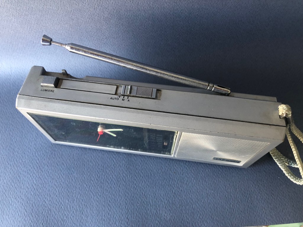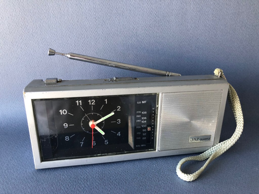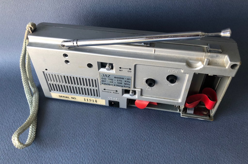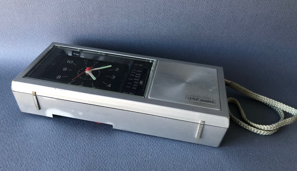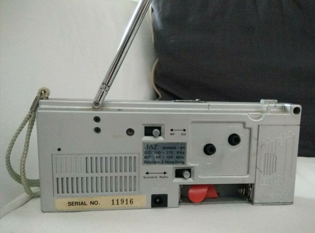 GATWIC , réveil radio analogique , gamme Jaz Quartz , mouvement électrique à pile ou secteur avec transfo 4,5 volts , calibre AG , Made in Hong Kong . Nouveauté du catalogue 1983 , réf.5005-31. Boîtier plastique gris métallisé , aiguilles et points lumineux , cadran noir , antenne télescopique et dragonne. Radio GO/MF , sonnerie à répétition , éclairage du cadran . Format 18 x 7,5 x 3,5 cm .