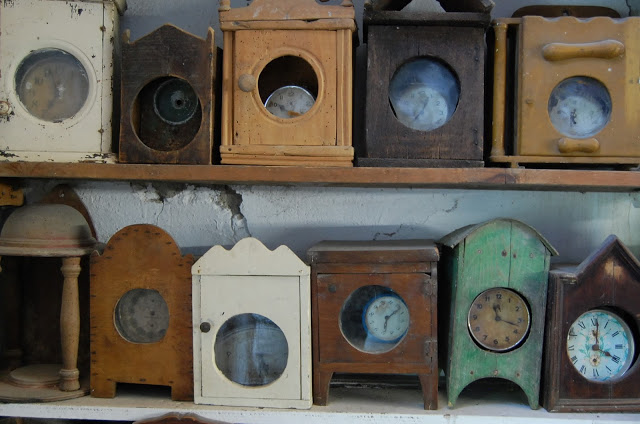 La vitrine des réveils ; on reconnait au fond un rare et très onéreux modèle.