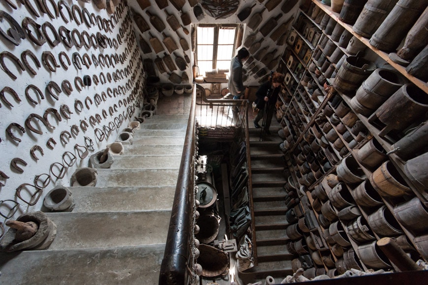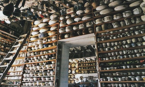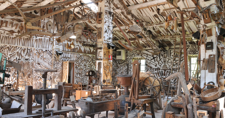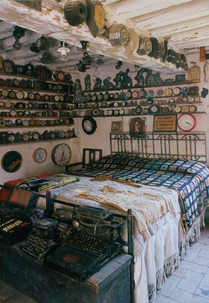 Toutes les pièces de sa ferme sont gavées dans une accumulation ordonnée par son esprit, au point de faire disparaître les plafonds et garnir jusqu’aux rampes des escaliers