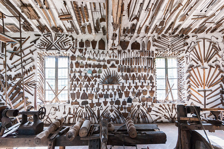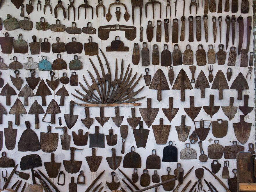 Des marteaux, des pinces, des pelles, des pioches, des ciseaux à bois, recouvrent les murs suivant les intentions géométriques du maître des lieux.