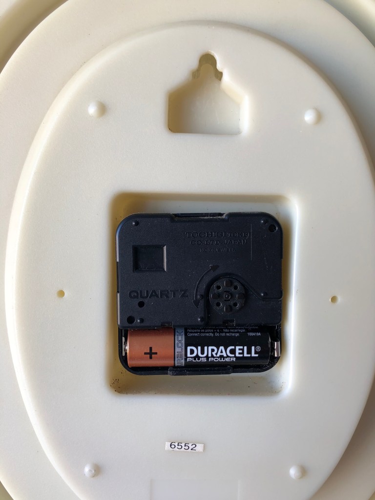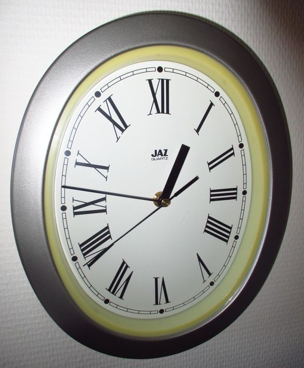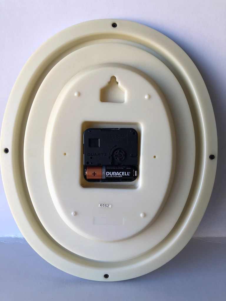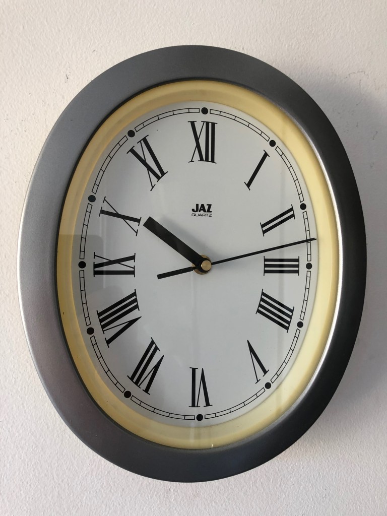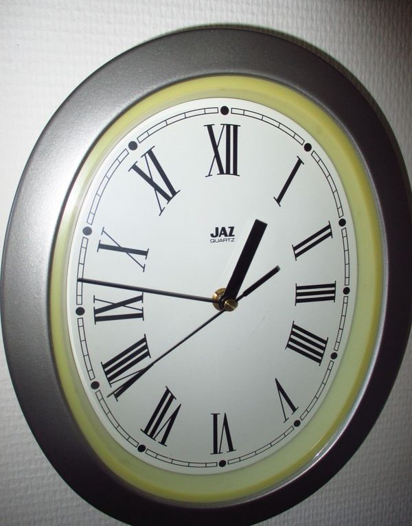 6552/6552 bis, horloge murale , gammes Les Pratiques et Jaz Quartz , corps ovale en plastique , aiguilles bâtons noires , trotteuse centrale, chemin de fer ovale au pourtour du cadran, chiffres romains , disponible de 1990 à 1994 ,mouvement à quartz , mvt Tochigi Tokei Japan. Format 29 x 24 cm.
